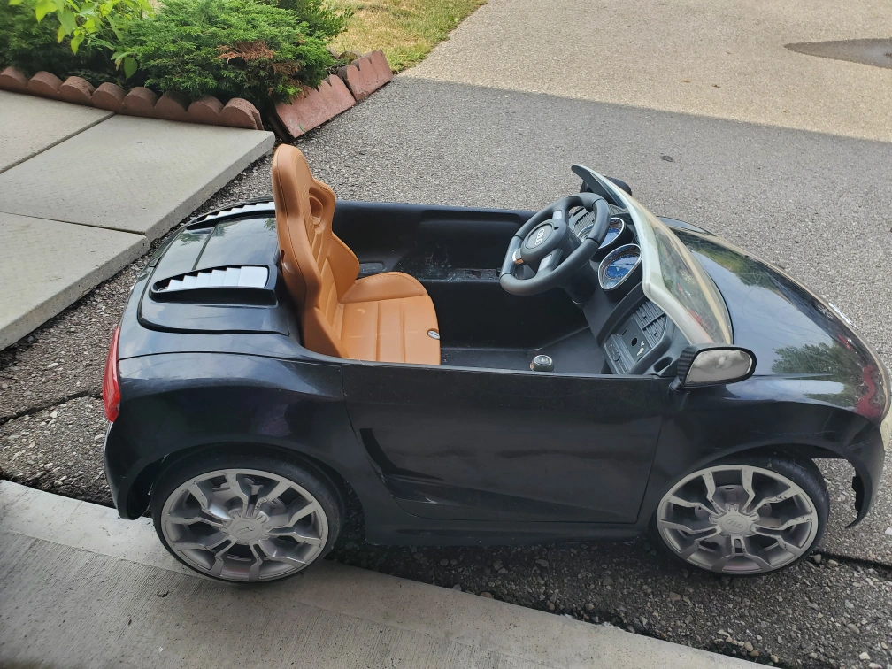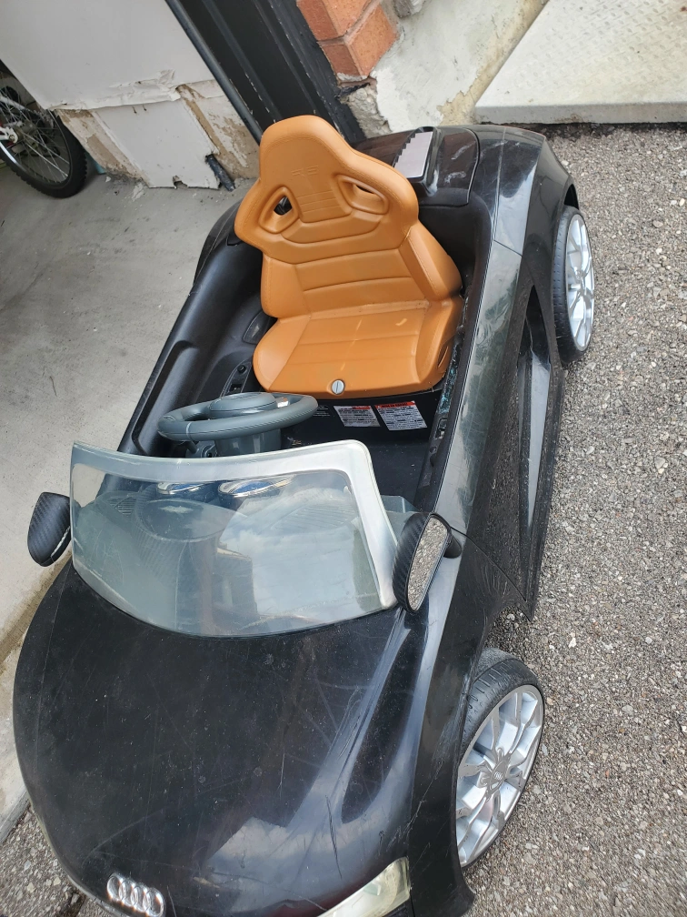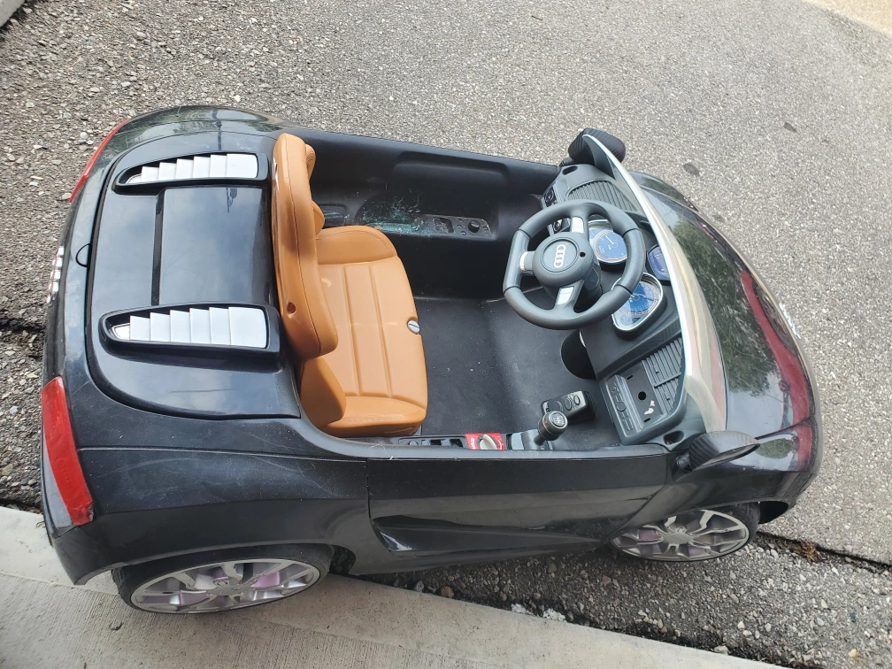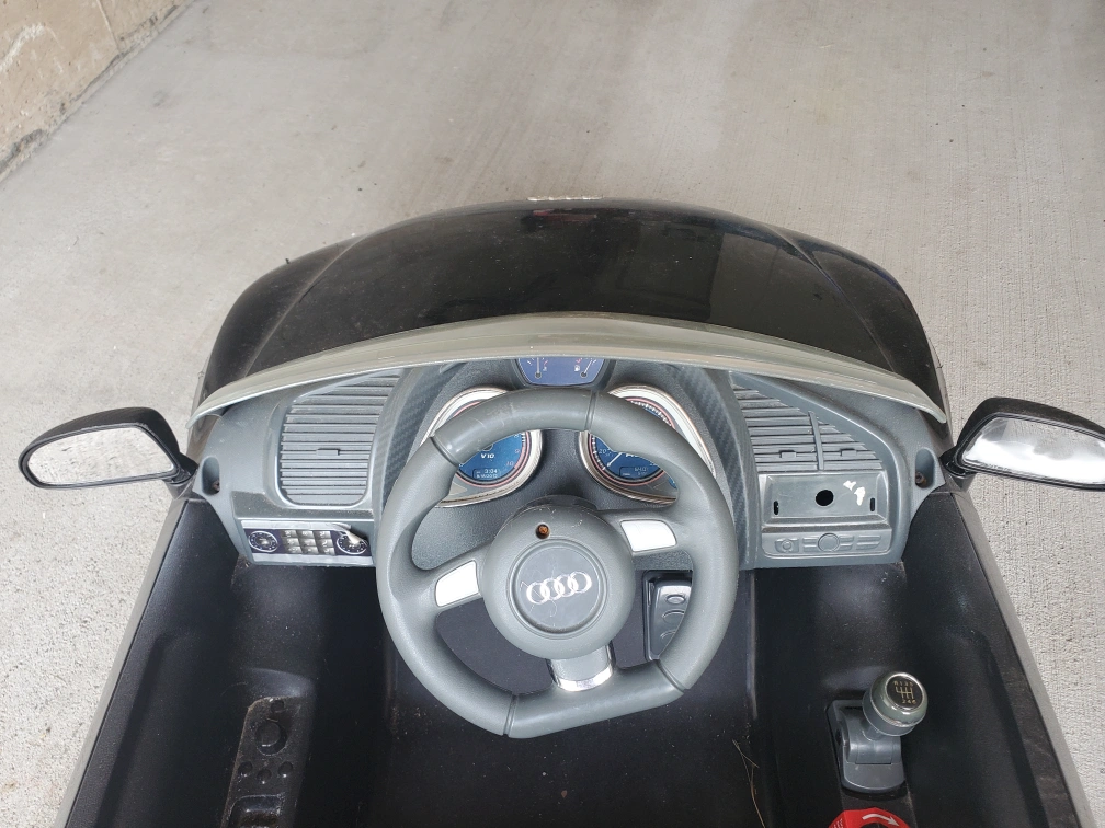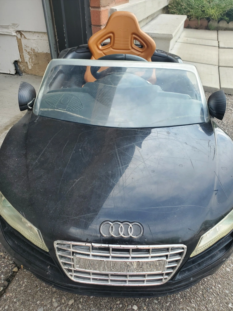 Selling an Audi R8 Spyder ride-on car for kids! It's black with a tan seat and has the Audi logo on the front. comes with charger 1 time full charge goes for around 30 '40 mins