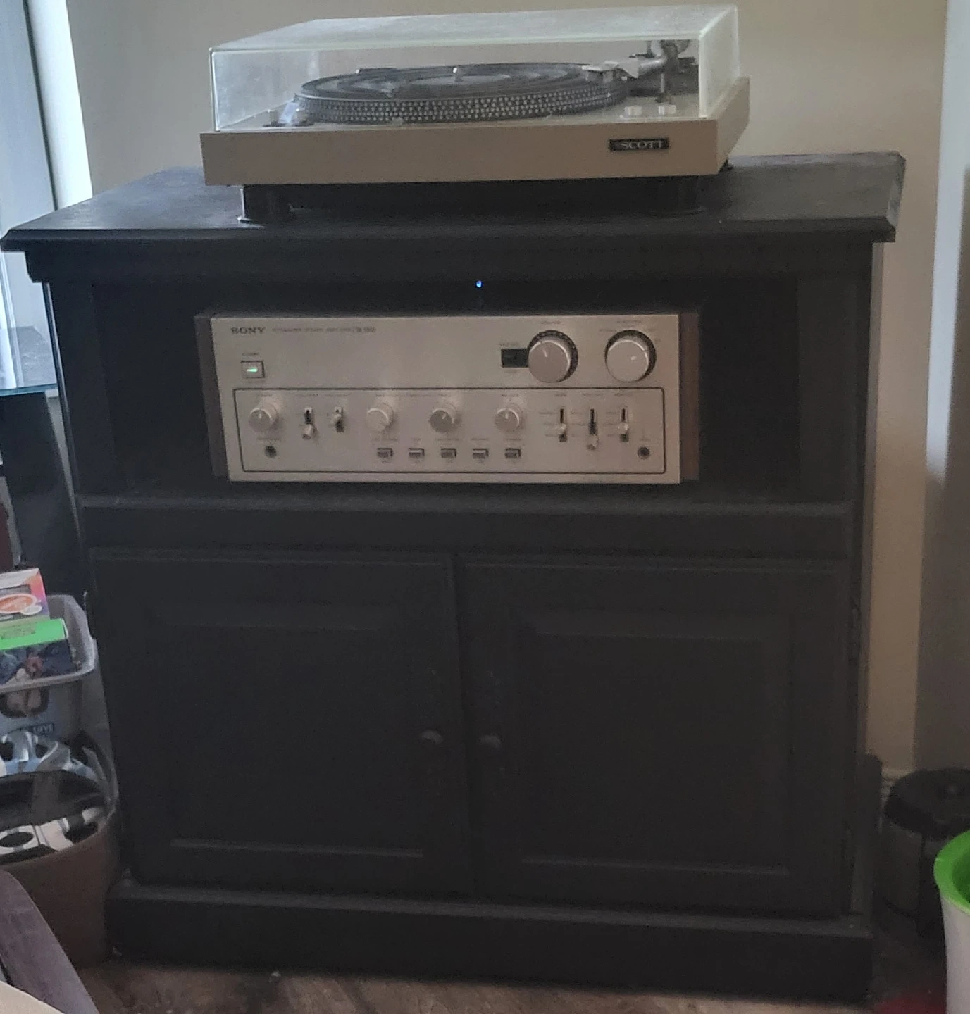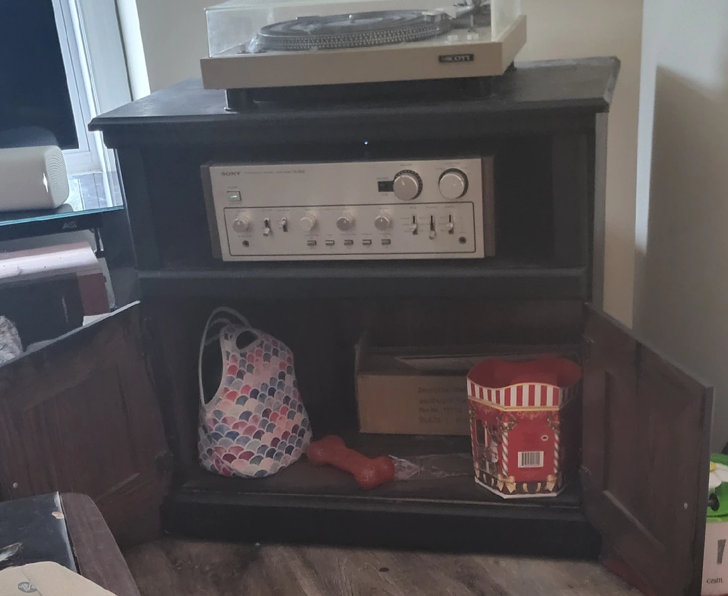 10Selling an audio equipment cabinet . The cabinet is black and has a two-door compartment for storage. Great for setting up your vintage audio system! stereo and turntable are not included.