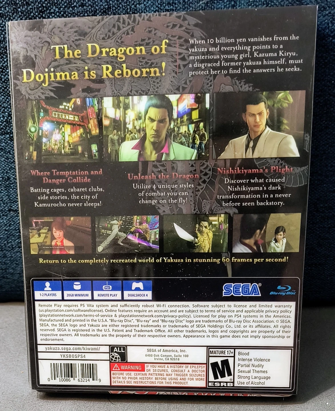 PlayStation 4 - Yakuza Kiwami. Steelbook Edition. Includes the Blu-ray disc and case.