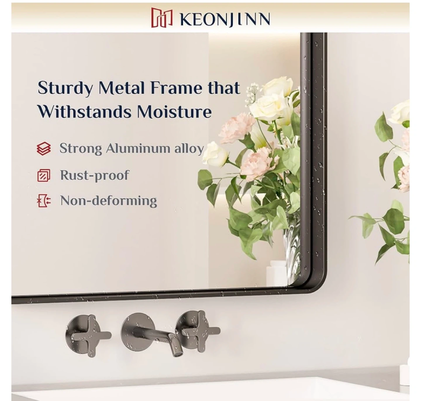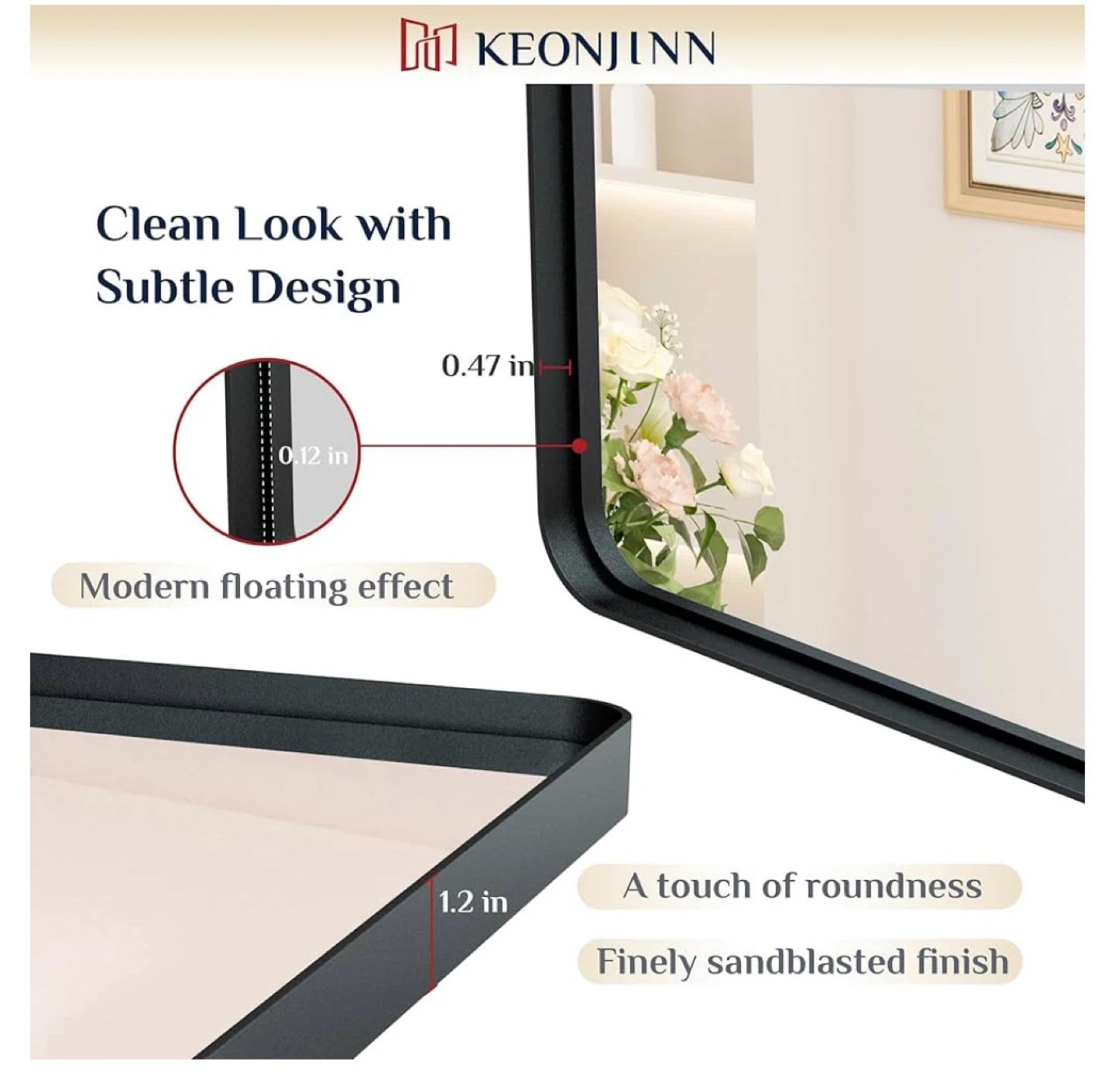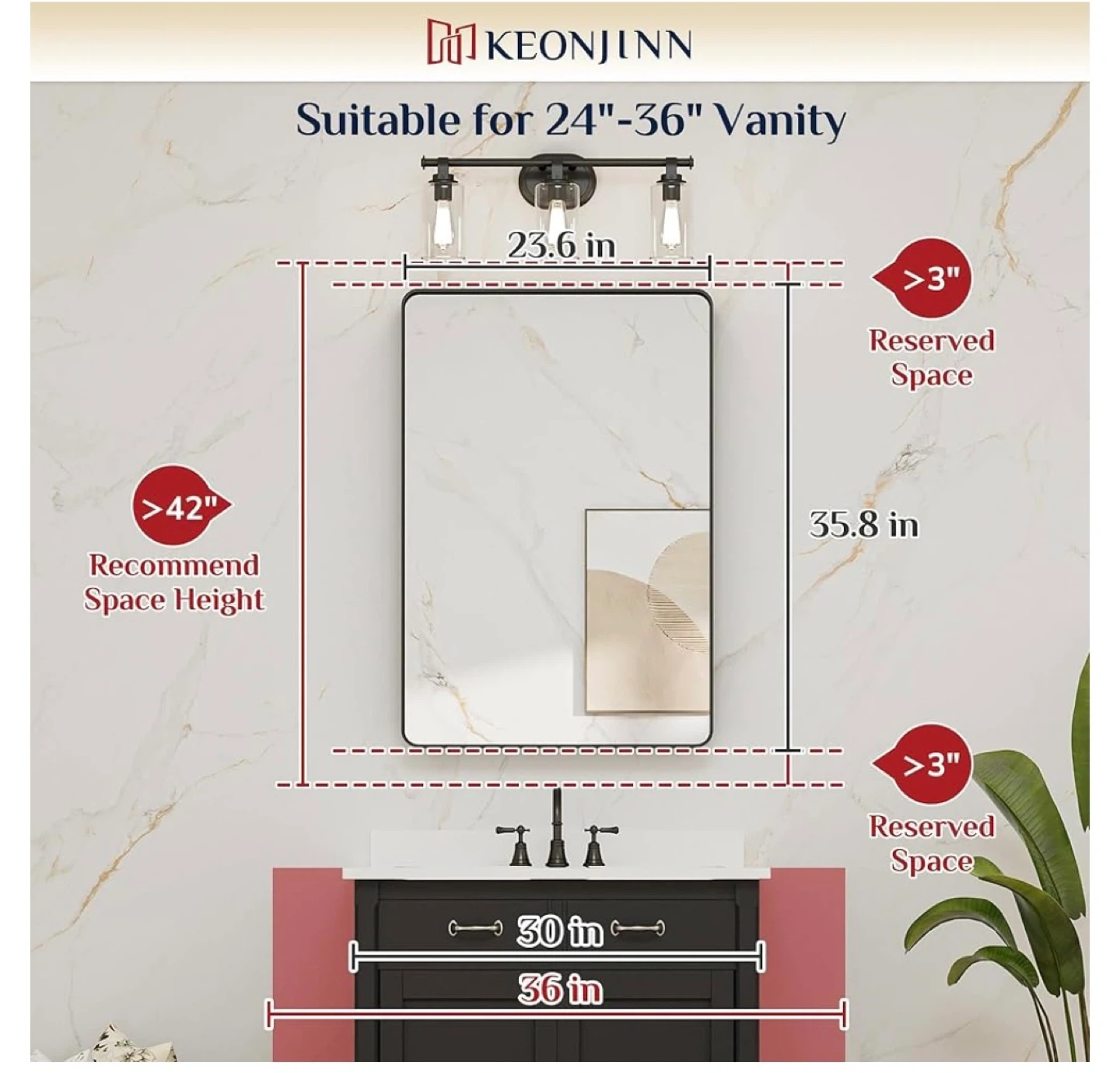 This KEONJINN bathroom mirror features a sturdy aluminum alloy metal frame with a rust-proof and non-deforming design. Its dimensions are 23.6 inches wide by 35.8 inches tall. It's suitable for vanities between 24"-36" wide and offers a modern floating effect with a finely sandblasted finish.