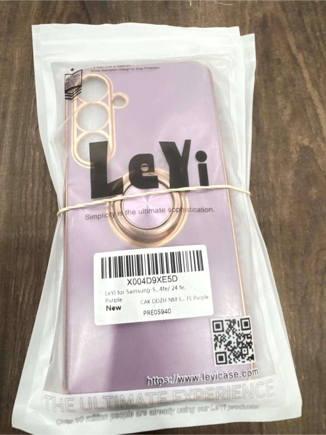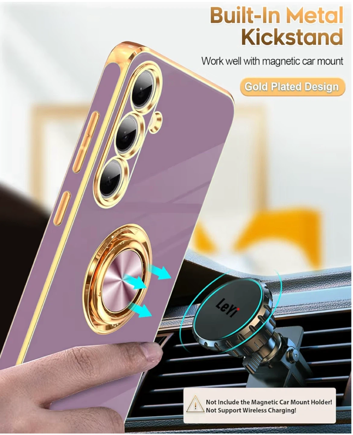 This Leyi phone case is designed for Samsung S24 FE and comes in a purple colour. It features a built-in metal kickstand and a gold-plated design for a stylish look. The ring stand allows for 360-degree horizontal and 100-degree vertical rotation, offering convenience for hands-free viewing. Not compatible with wireless charging.