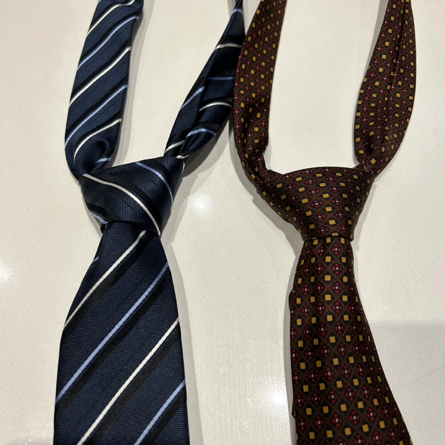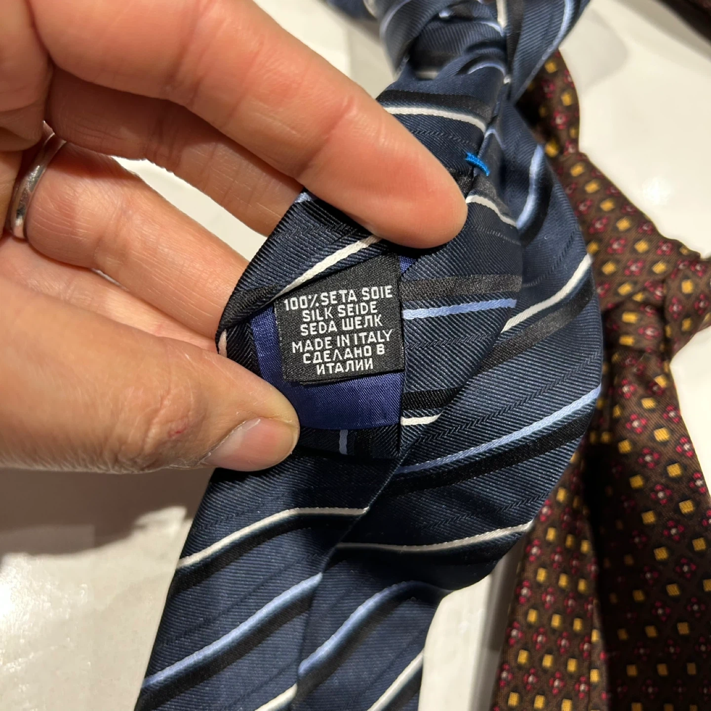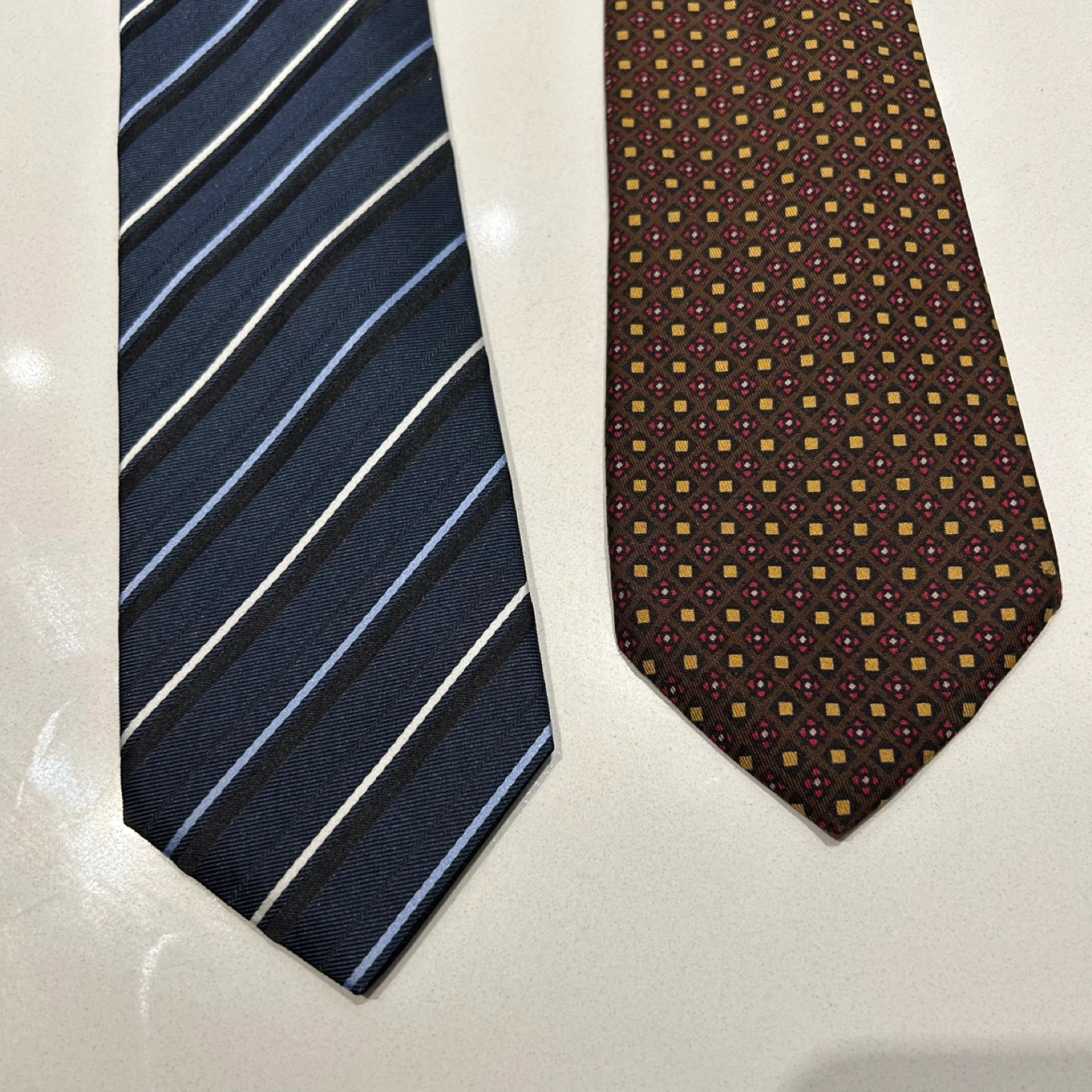Two neckties, one blue with stripes and the other brown with a patterned design. The blue tie is 100% silk and made in Italy. The brown tie is also silk and made in England for Lane Crawford by Michelsons of London.