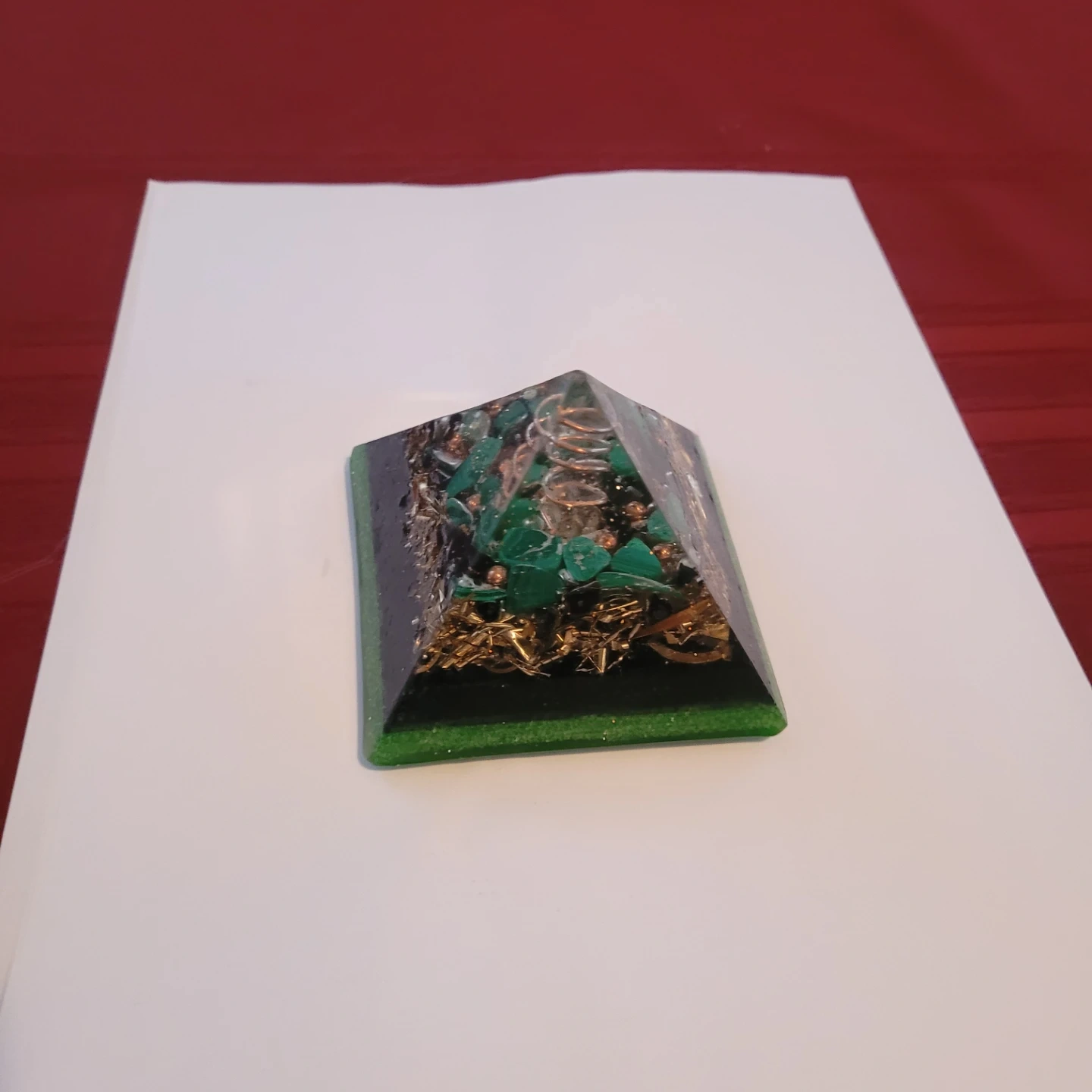 This orgone energy pyramid features green crystal chips, copper wire, and what appears to be resin. It's designed to harmonize energy fields. It's an interesting piece for decoration or spiritual practices.