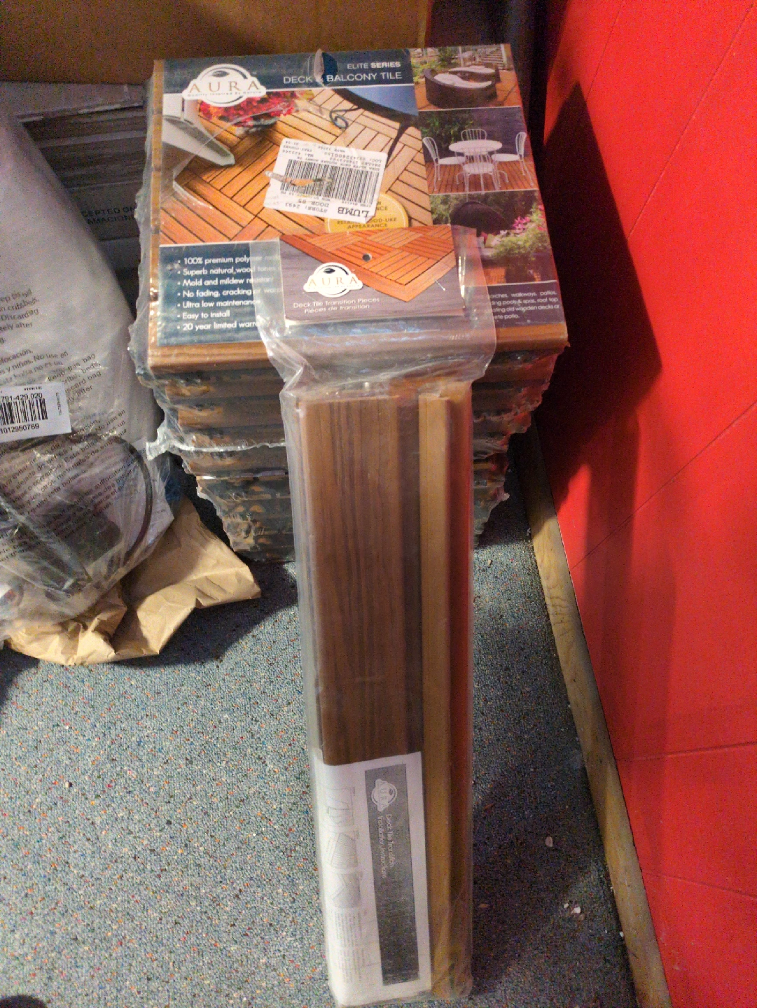 18Spruce up your outdoor space with these Aura Elite Series deck and balcony tiles! They are made from 100% premium polymer material with superb natural wood tones and texture. These tiles are mold and mildew resistant, and ultra low maintenance. Easy to install and come with a 20-year limited warranty. Price is for: 1 pack tile and comes with 1 pack of transitions as well. 4 packs of new deck tiles (10 tiles per pack) 11.8x11.8"and 4 packs of new transitions together. 3 pack of new transitional sold separately $10. I can sell piece as needed as well. I also have 13 pieces opened because pack ripped open. I certainly over purchased!! that's my backyard and these tiles have been installed for 5 years now. they are durable and spruce up the place, I highly recommend the product. very easy to install and cut.