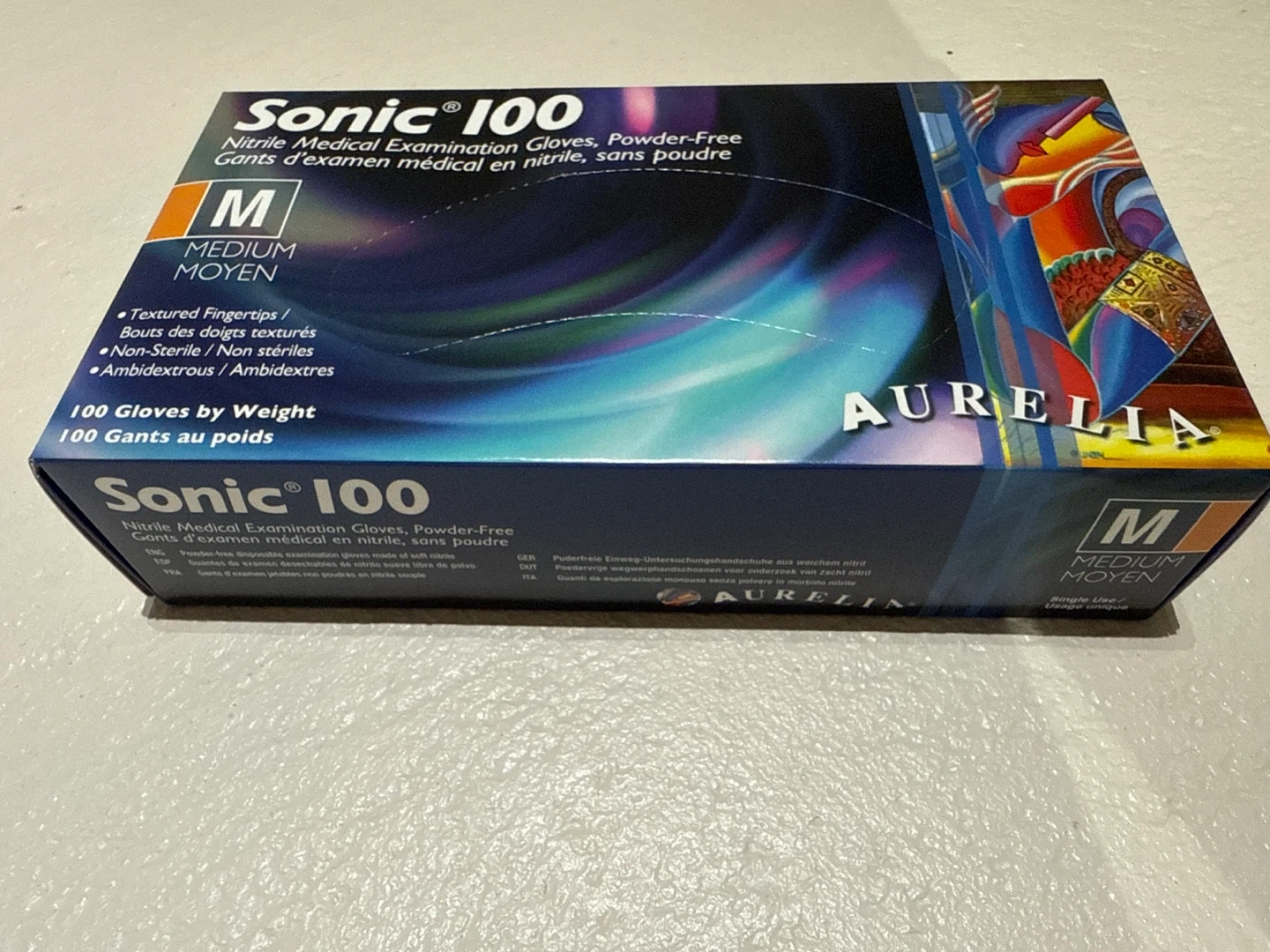 60Selling a box of Aurelia Sonic 100 Nitrile Medical Examination Gloves. These are powder-free and size Medium. Each box contains 100 gloves by weight. Perfect for various uses! 3 Brand New Box Available!!!