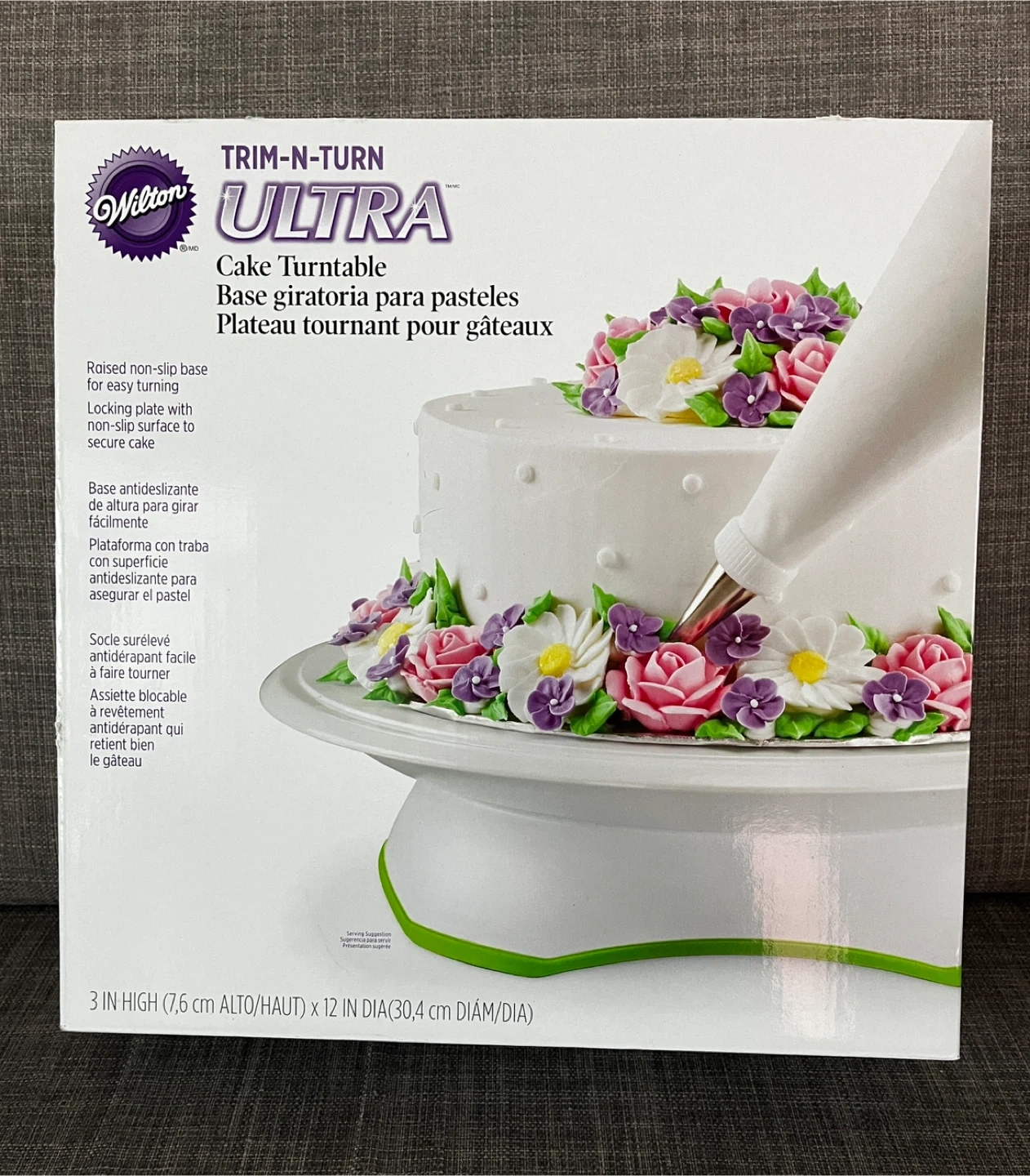 I'm selling a Wilton Trim-N-Turn Ultra Cake Turntable! It's perfect for decorating cakes with ease. The turntable features a raised, non-slip base for easy turning, and a locking plate with a non-slip surface to secure your cake. It measures 3 inches in height (7.6 cm) and 12 inches in diameter (30.4 cm).