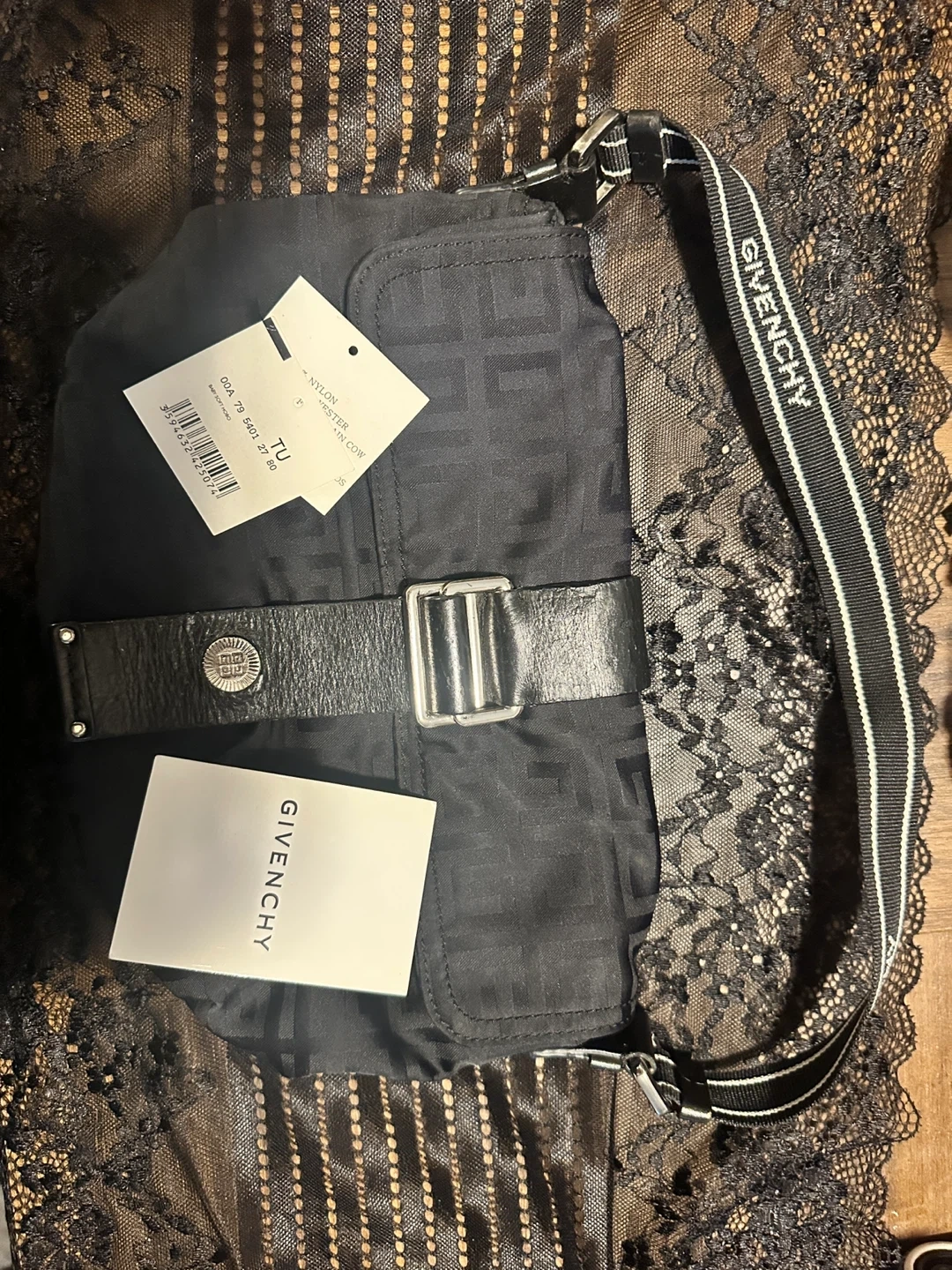This is a stylish Givenchy shoulder bag in black nylon! It features a unique pattern and a comfortable shoulder strap with the brand name. The bag is in great condition and ready for a new home. It's perfect for everyday use or a night out