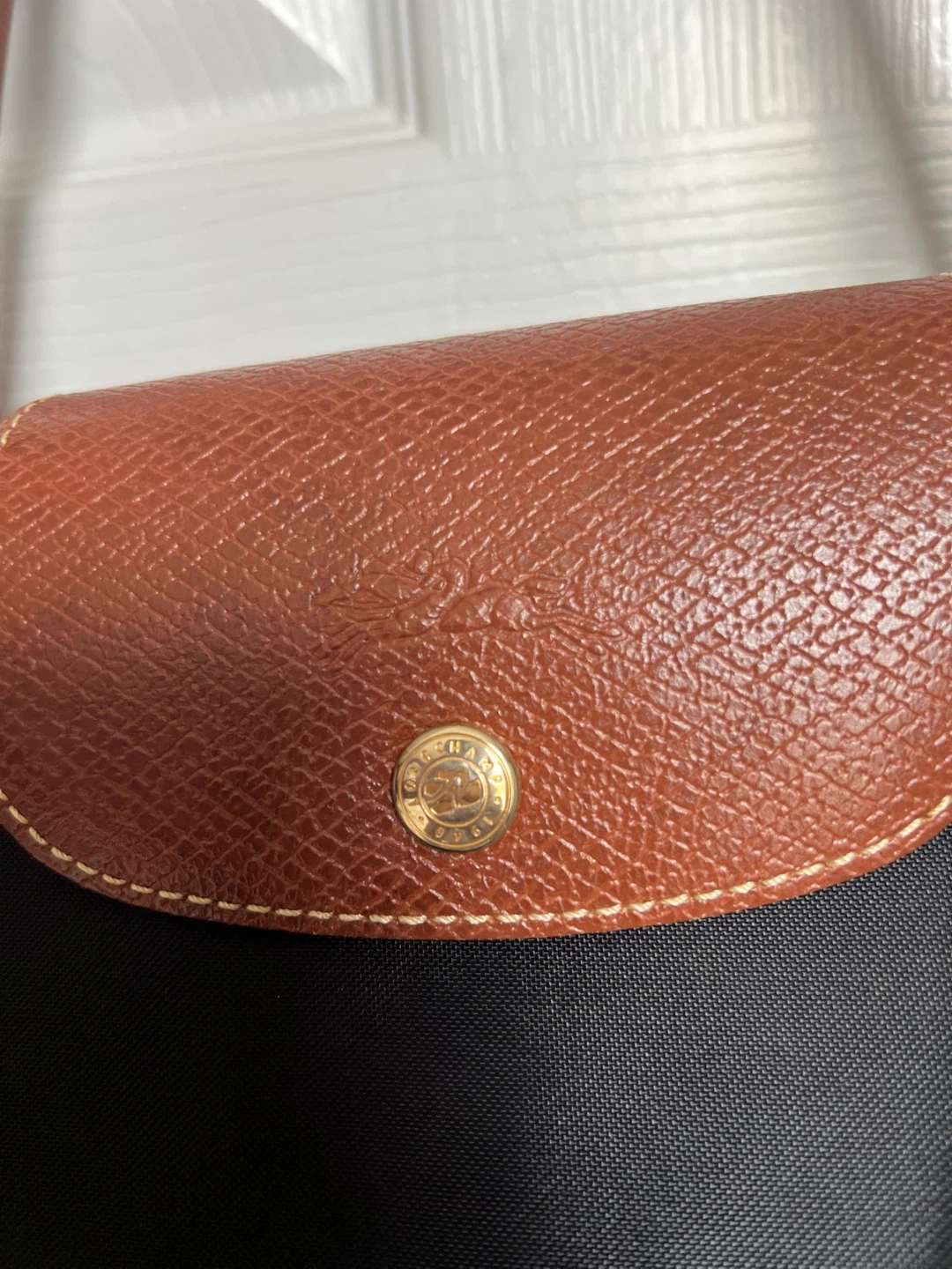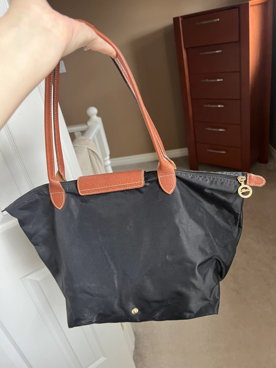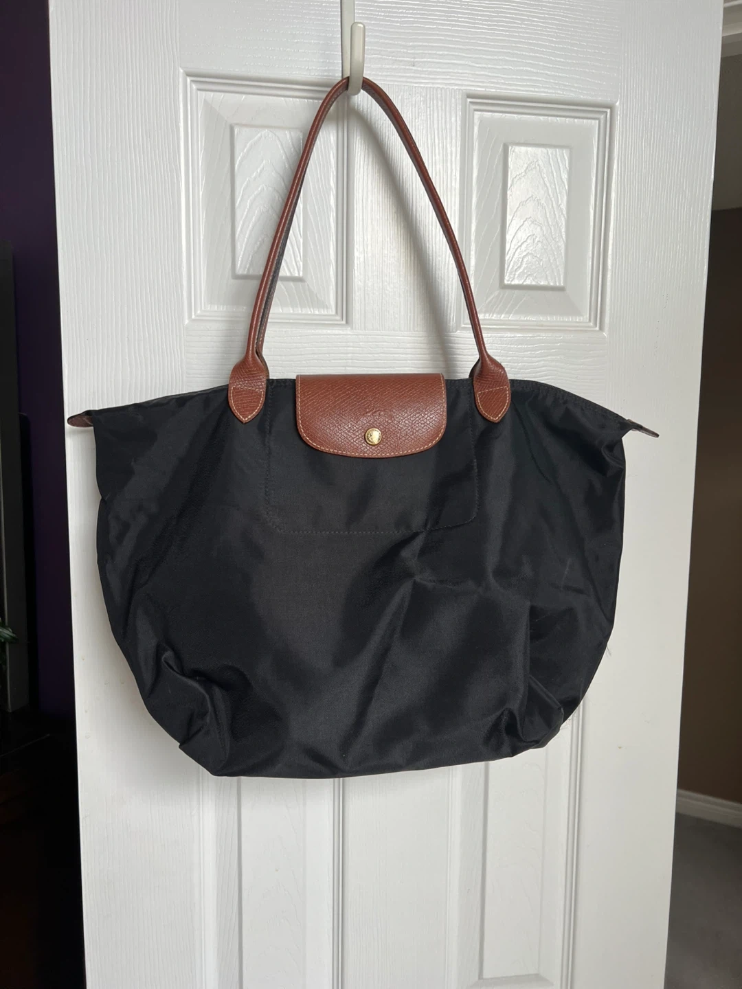 86Selling a Longchamp Le Pliage tote bag in black. It's in great condition and ready for a new home! The bag features brown leather accents and is perfect for everyday use
