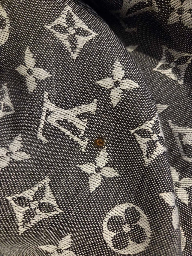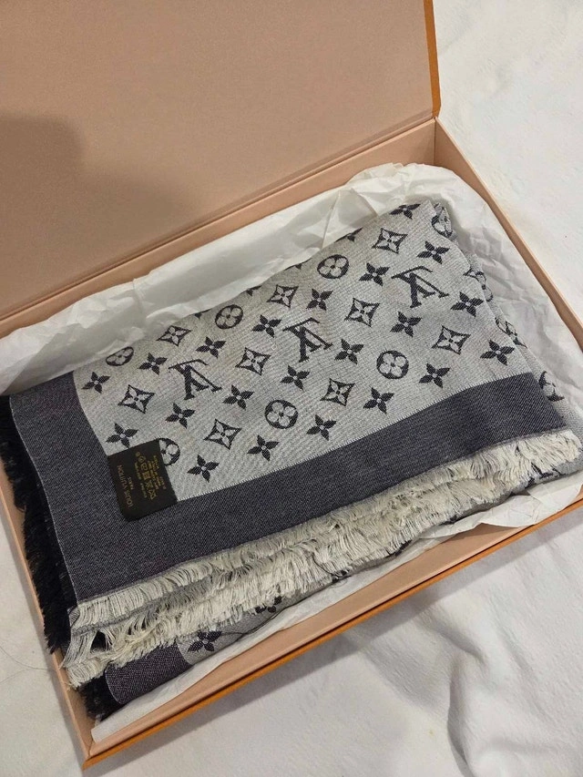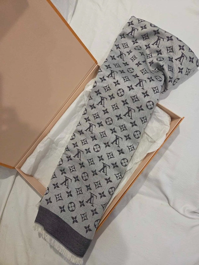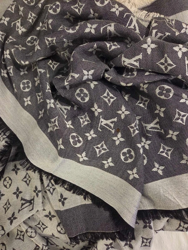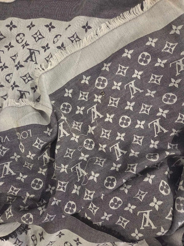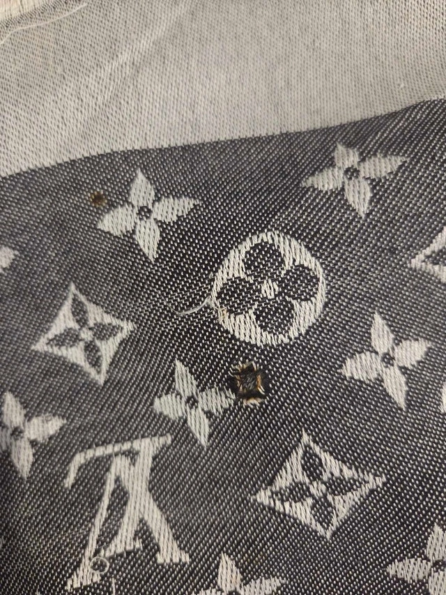 10Original retail price $785. This is an authentic LOUIS VUITTON Silk Wool Monogram Denim Shawl in Black (2018). The elegant scarf is crafted of 60% silk and 40% wool with the Louis Vuitton monogram in black and grey. It is a large square with fringed borders and can be tied around the body in any number of ways for very stylish looks. Price reduced two tiny barely noticeable burn holes (as pictured). A smoker grazed the scarf causing the tiny holes. They do NOT affect the overall beauty or wearability of the scarf. Comes with original box and tissue. For Sale By: Owner