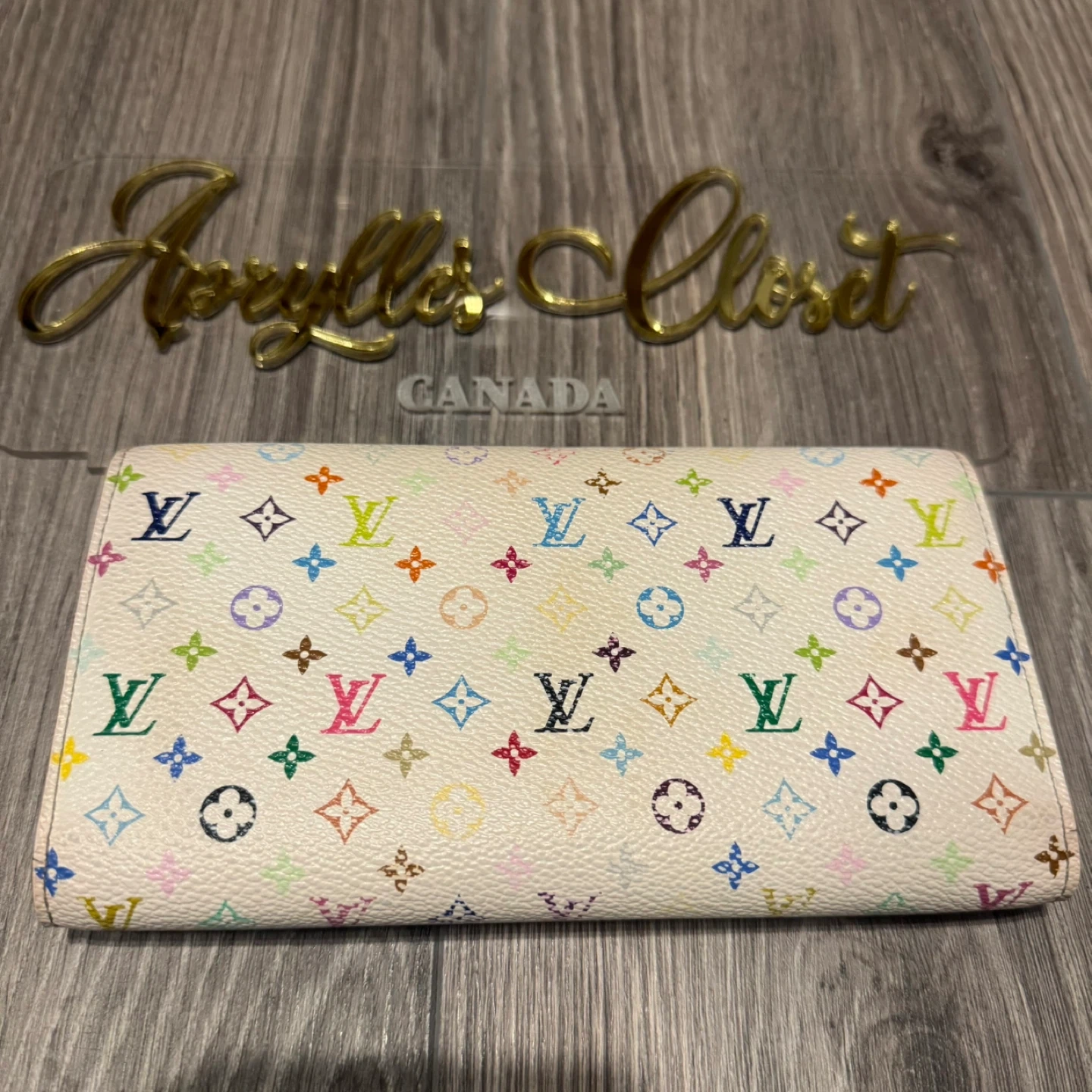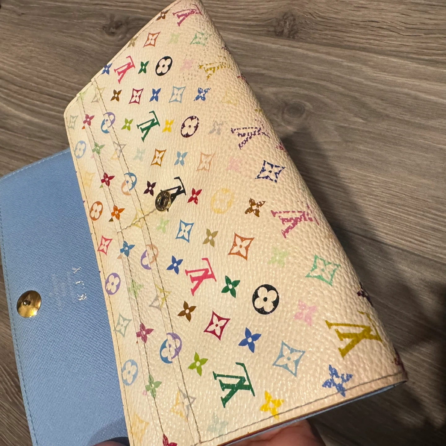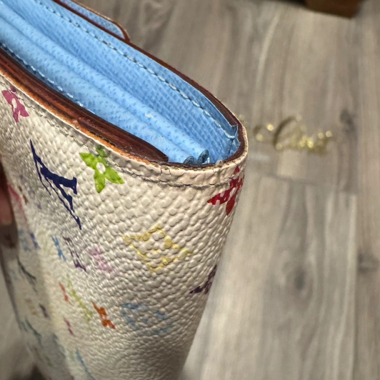 This Authentic Louis Vuitton long wallet features the iconic multicolor white monogram pattern on a white background. It's a stylish and functional accessory to keep your essentials organized. The interior is lined with a light blue material and has plenty of slots for cards and cash. It's in good used condition and ready for a new home! Please refer to photos for overall condition of wallet. A few slight fading on folds of the wallet but no major rubs. No returns. No exchange! All sales are final!