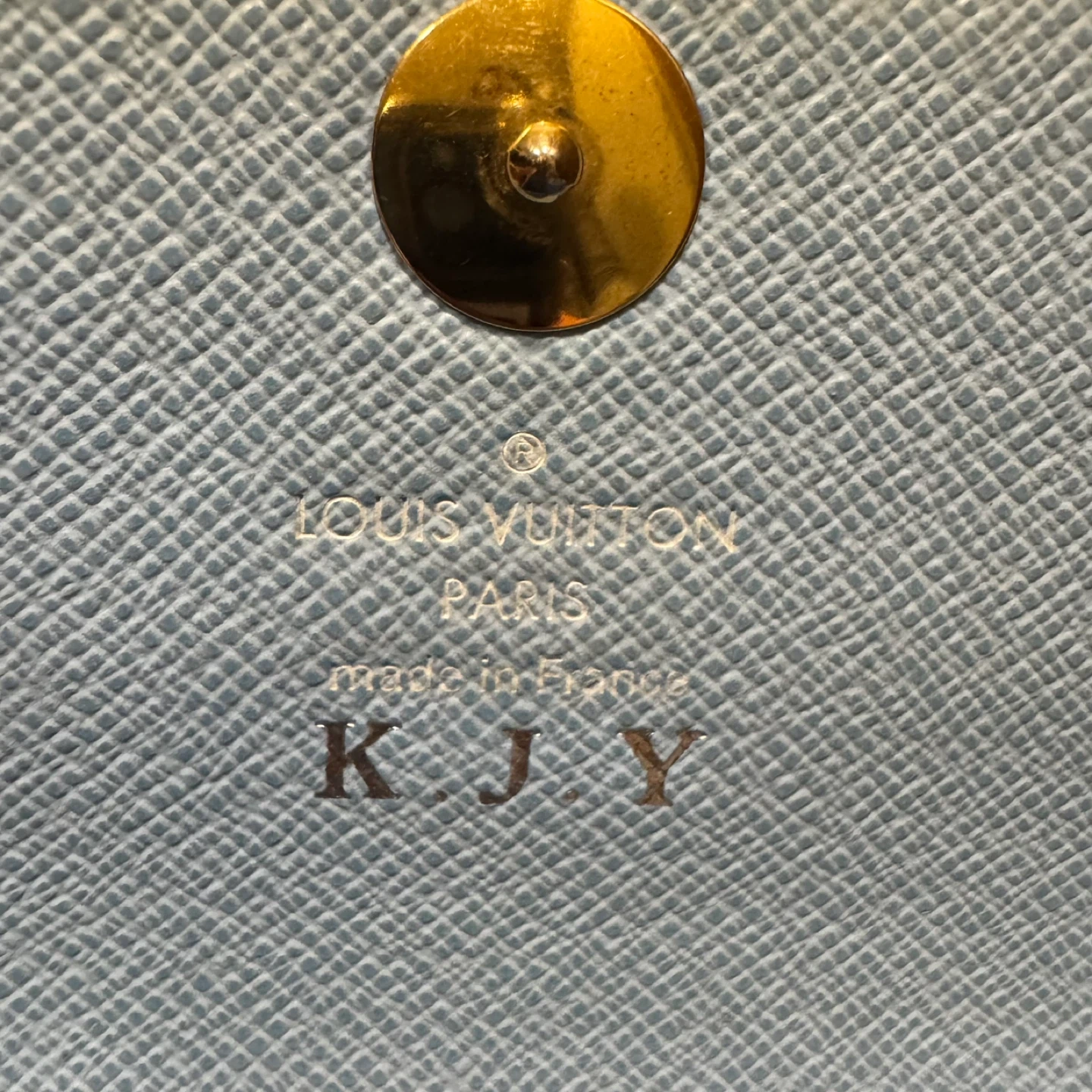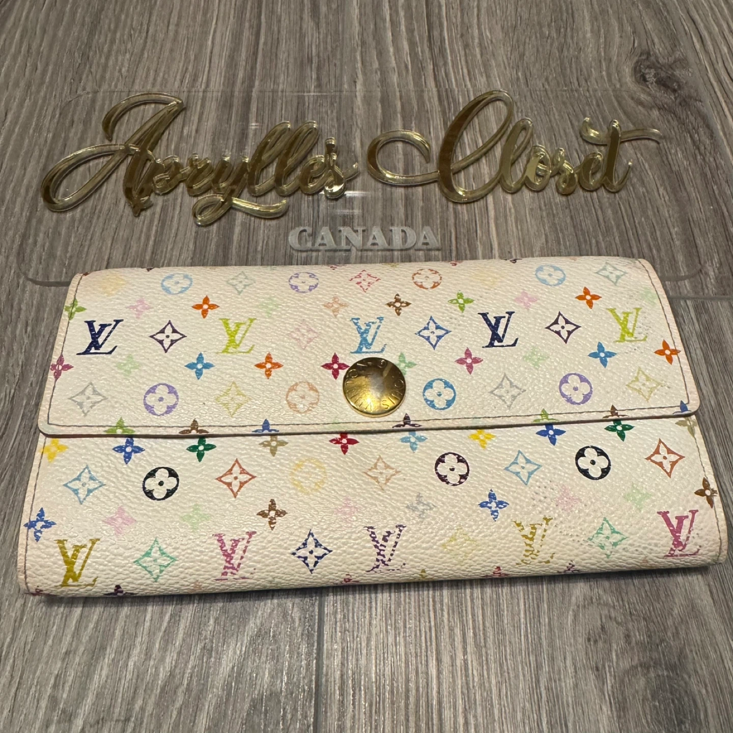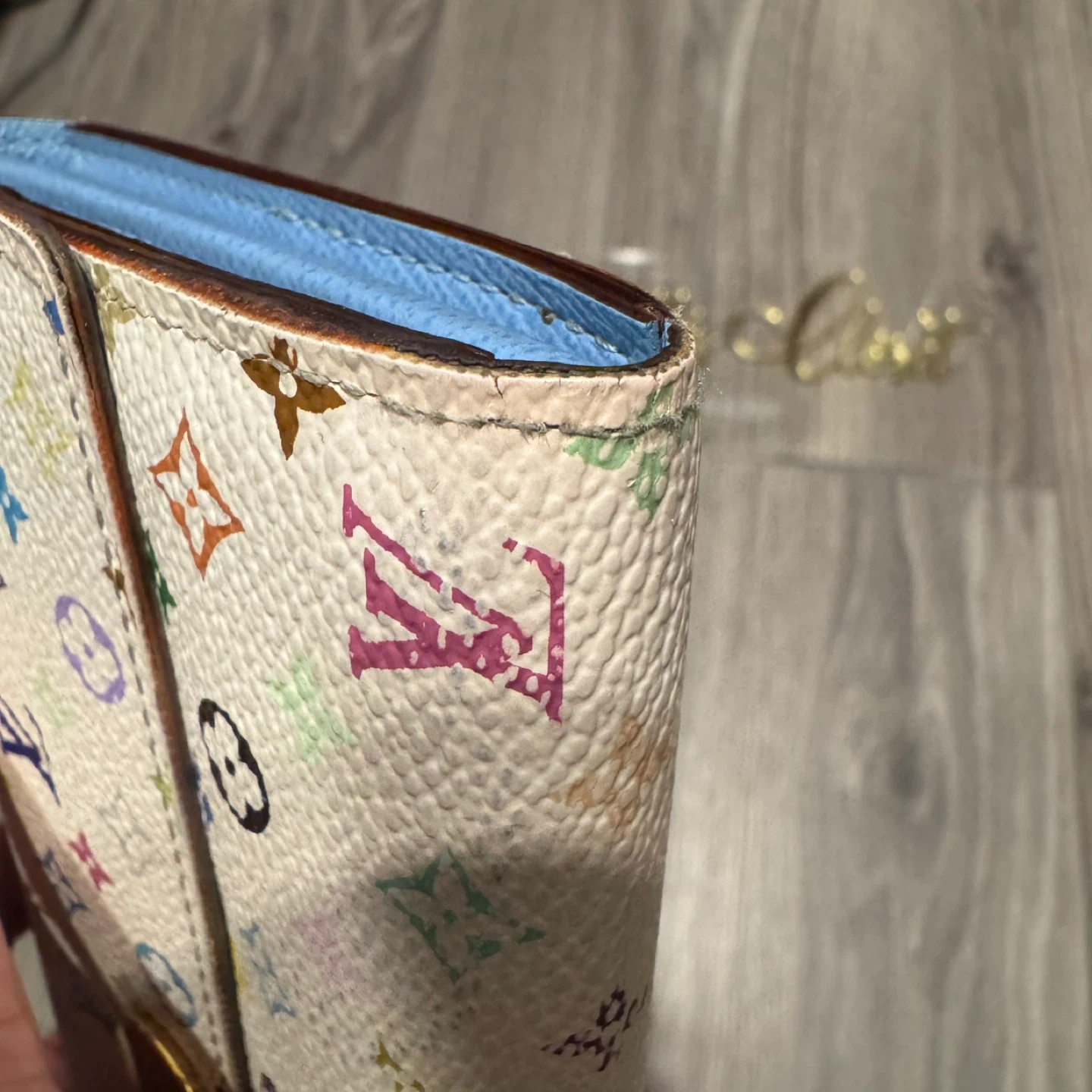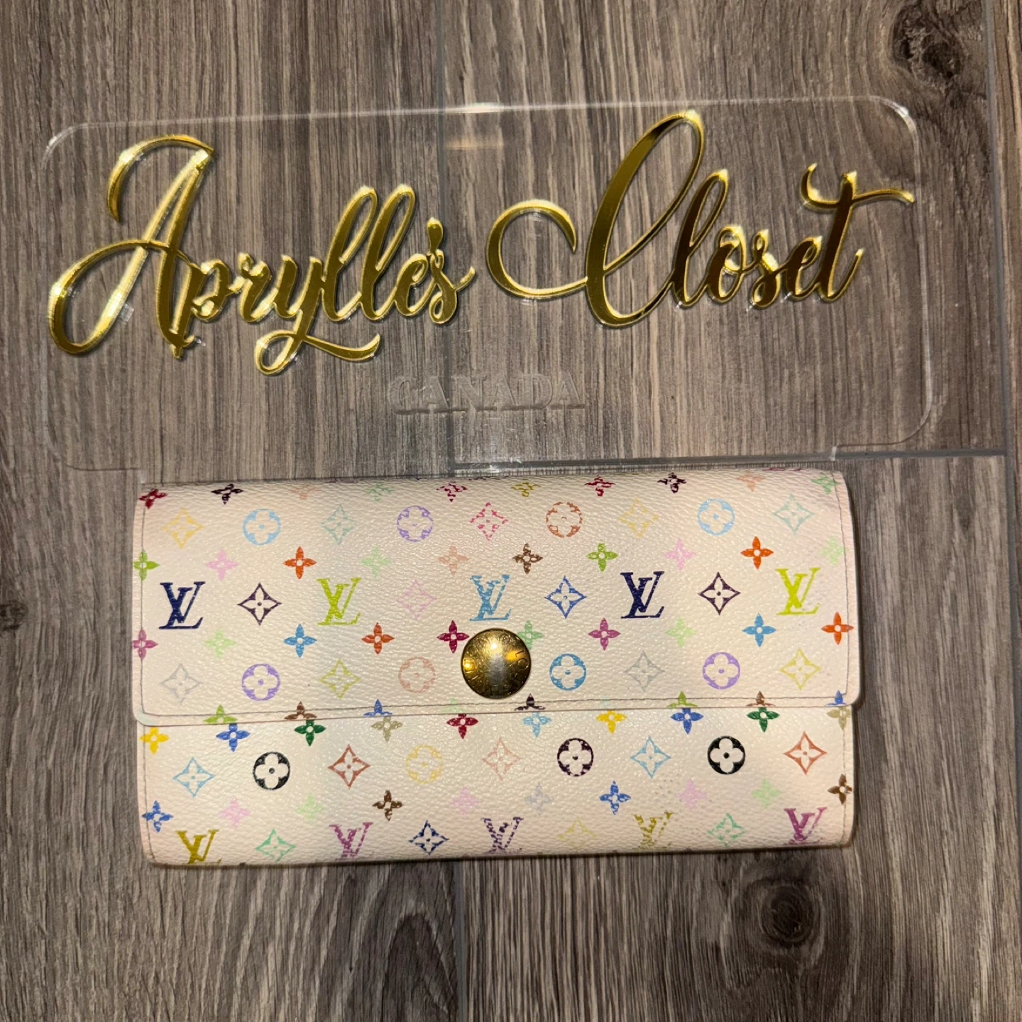 This Authentic Louis Vuitton long wallet features the iconic multicolor white monogram pattern on a white background. It's a stylish and functional accessory to keep your essentials organized. The interior is lined with a light blue material and has plenty of slots for cards and cash. It's in good used condition and ready for a new home! Please refer to photos for overall condition of wallet. A few slight fading on folds of the wallet but no major rubs. No returns. No exchange! All sales are final!