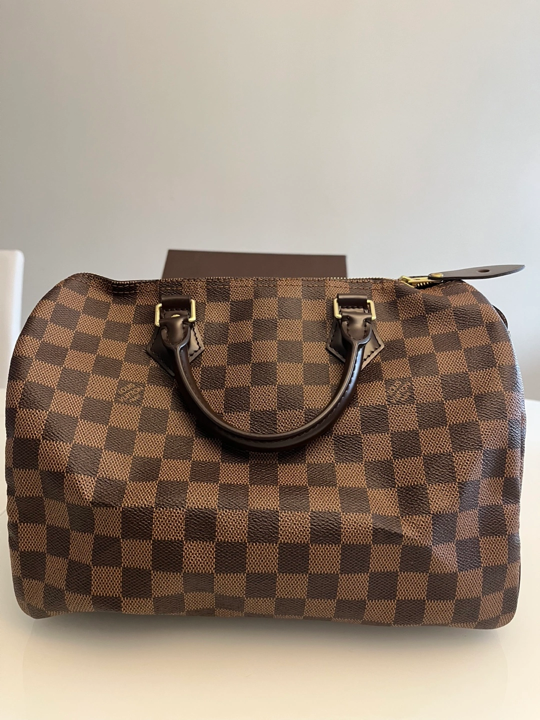 Pre-owned Authentic Louis Vuitton Speedy 30 handbag. Damier Azur canvas. Brown leather trim. Gold-tone hardware. Comes with box and dust bag.