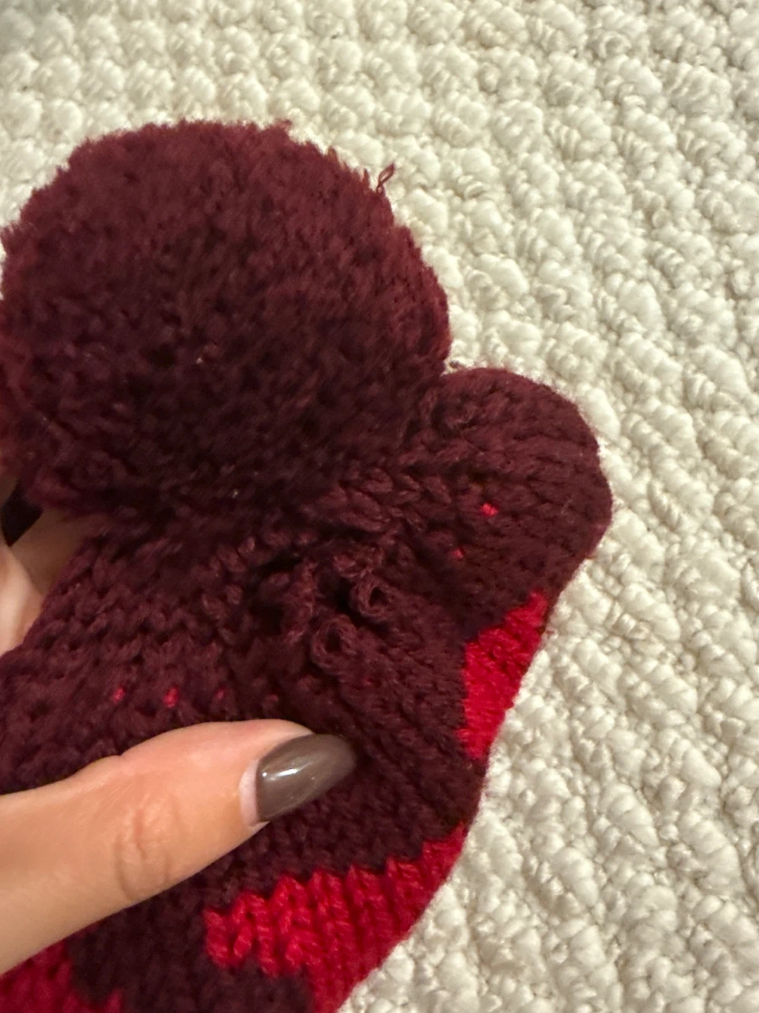 Authentic Louis Vuitton beanie with logo design in burgundy and red Selling for a low price as it has a hole at the top near the pom pom. Please do not lowball as I can easily get the hole stitched