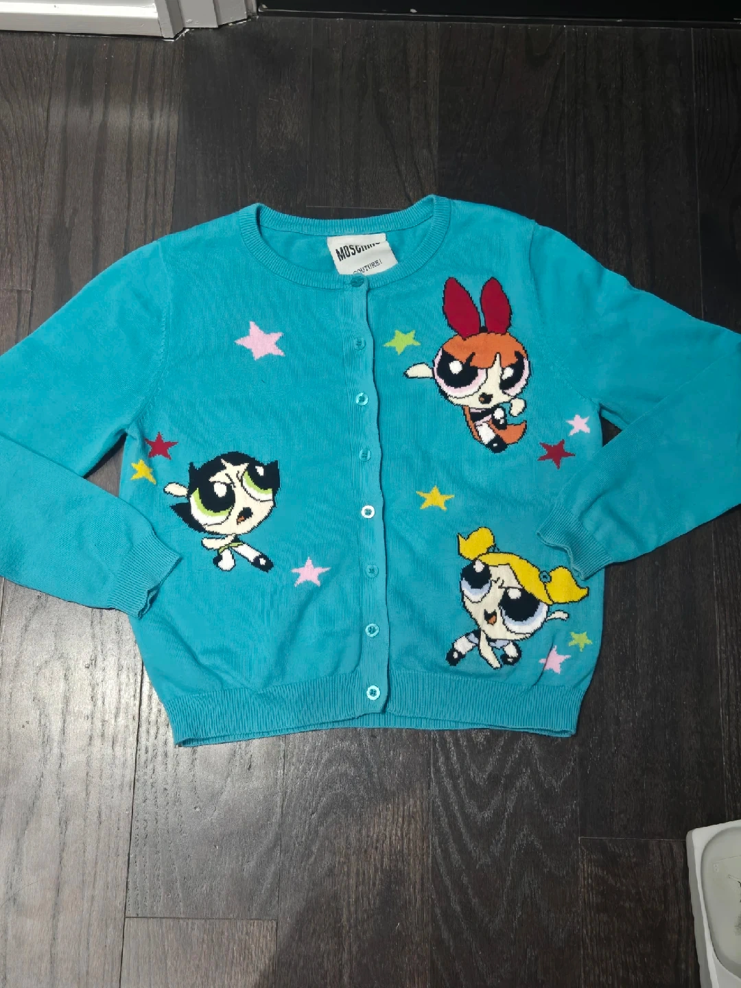 677Super cute turquoise Moschino Couture cardigan featuring the Powerpuff Girls! The material is soft and comfortable, perfect for adding a pop of fun to any outfit