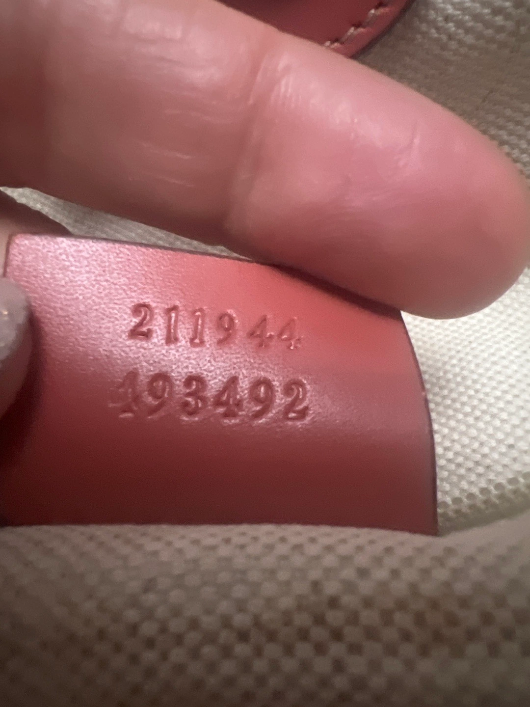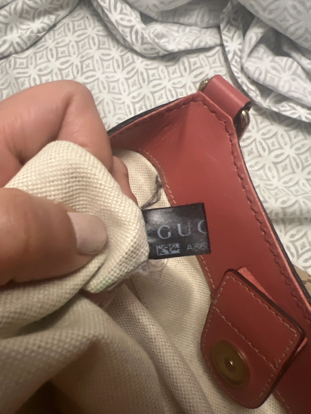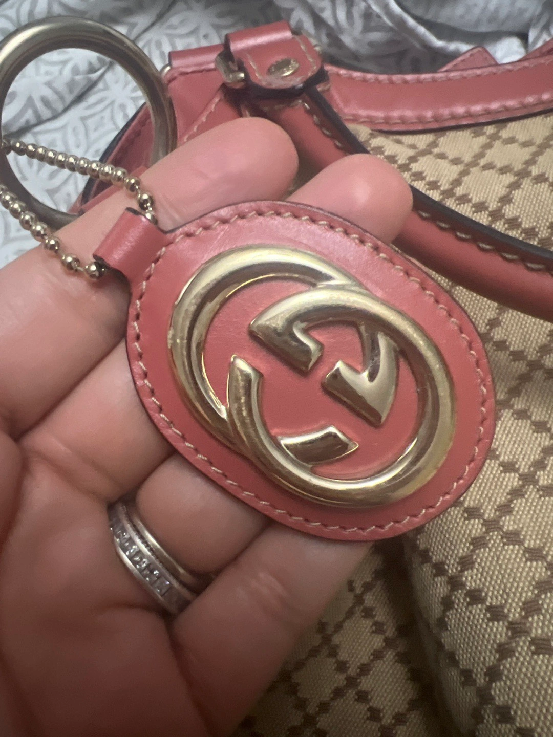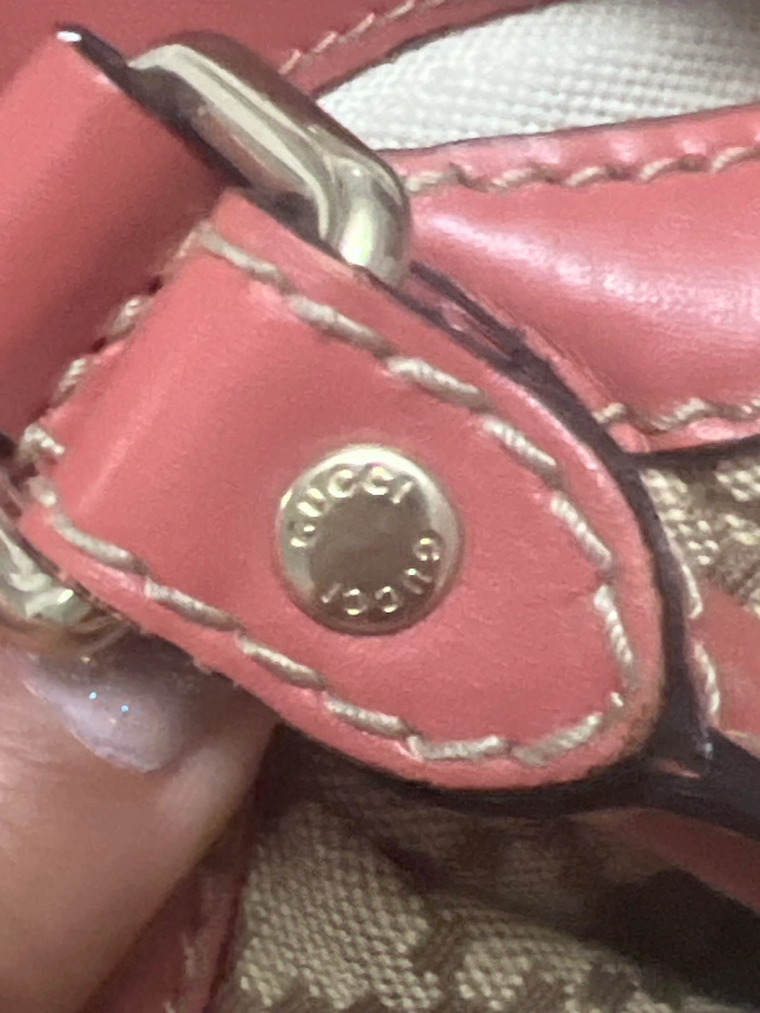 42Pre-owned Gucci handbag. Beige and brown GG pattern canvas. Coral coloured leather trim.