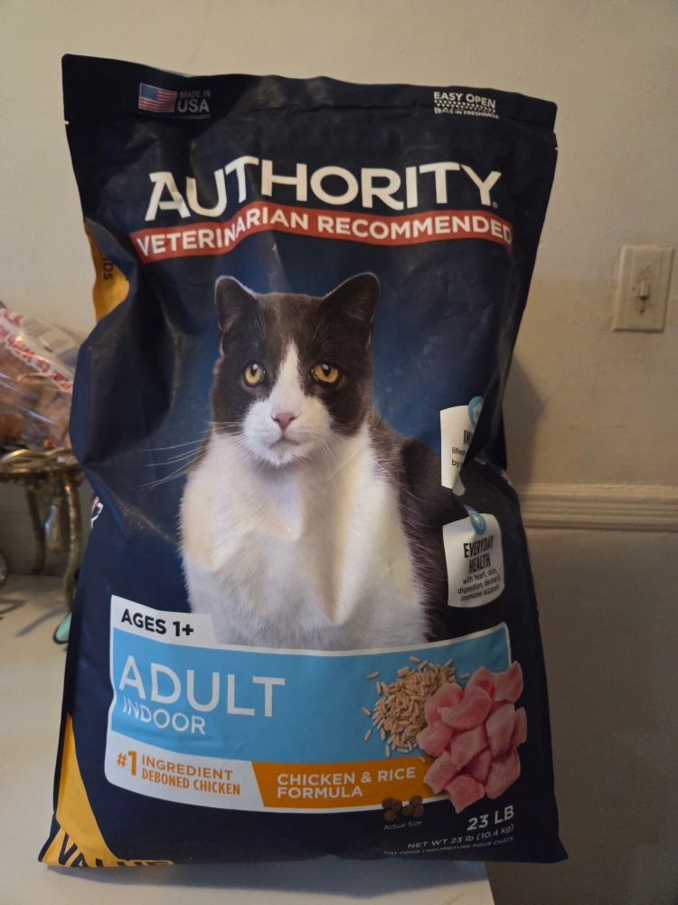Selling a 23 lb bag of Authority Adult Indoor Chicken & Rice Formula cat food! It's designed for cats aged 1+ and features deboned chicken as the #1 ingredient. Best if used by 2027 October 01