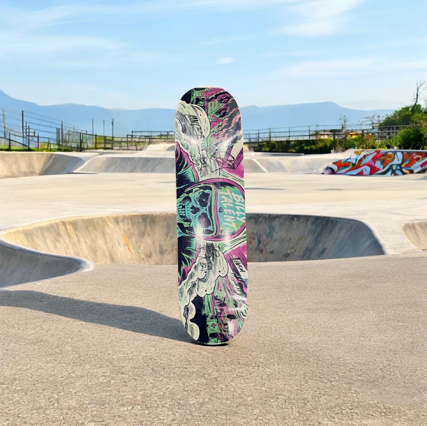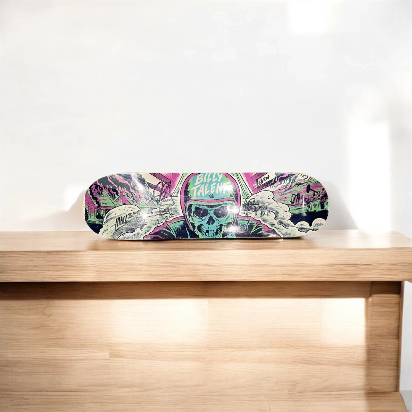 10This is a rare autographed Billy Talent skateboard deck in used condition, featuring a unique graphic. While it has been previously enjoyed, it remains a cool collectible for any fan or skateboard enthusiast. The deck shows signs of wear but the autograph is still in good condition.