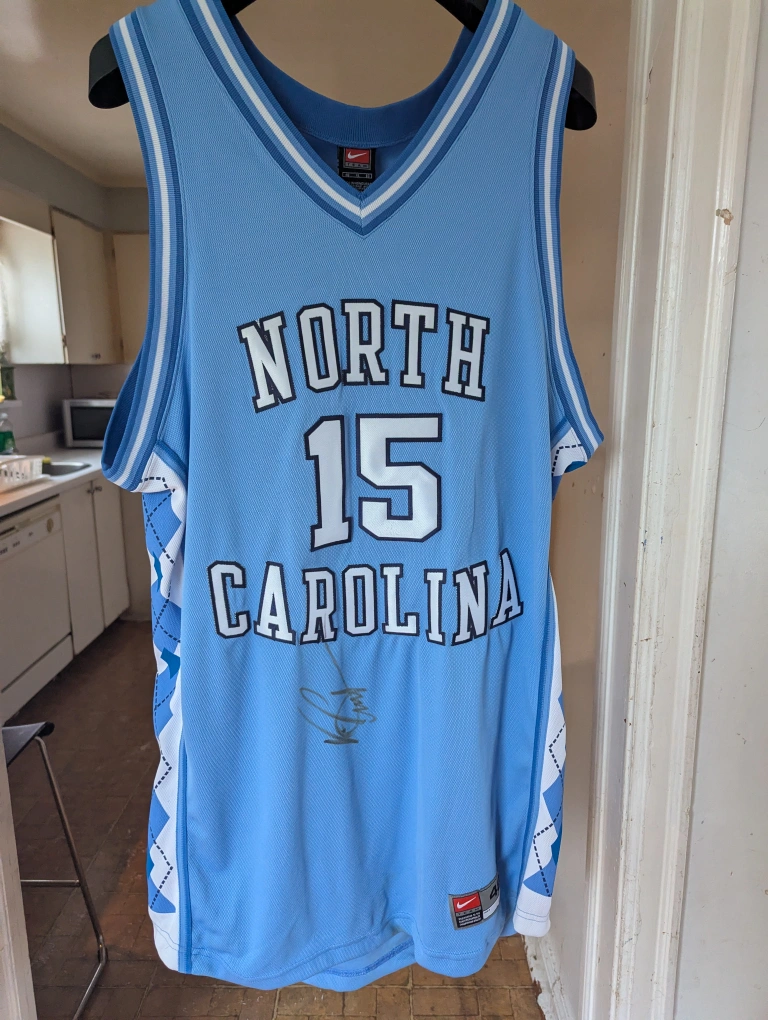 65Here's an autographed North Carolina jersey with #15 Vince Carter! It's a light blue colour and in great condition. Perfect for any basketball fan