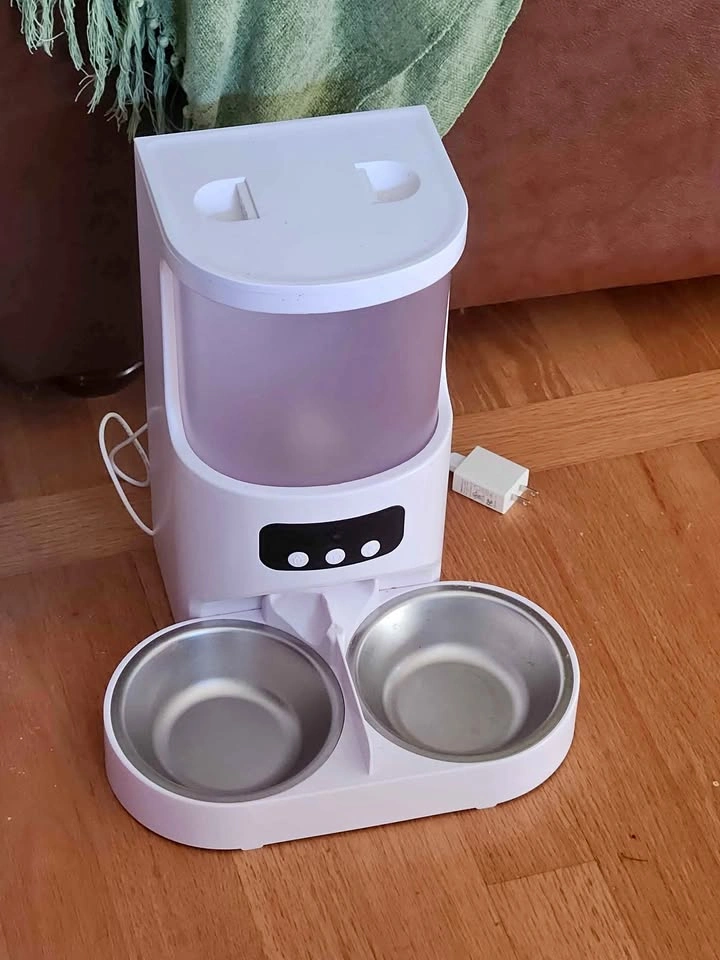 10Used once. Clean, disinfected, like new. Received as a gift but don’t need it. Works perfectly. Great for 2 cats or dogs. Features: 4L food capacity, feeds pets automatically Dual tray for 2 pets at the same time 1080P HD camera with night vision 2-way audio to see and talk to your pets Smart app control via 5G & 2.4GHz WiFi Easy to clean and set up