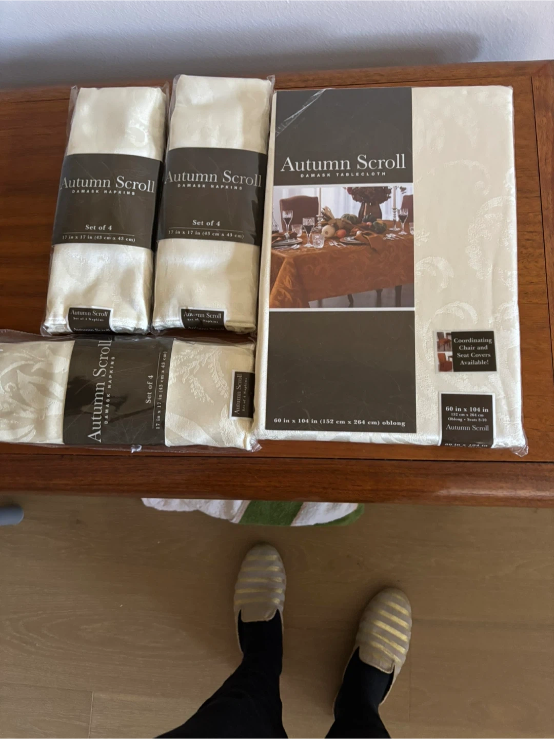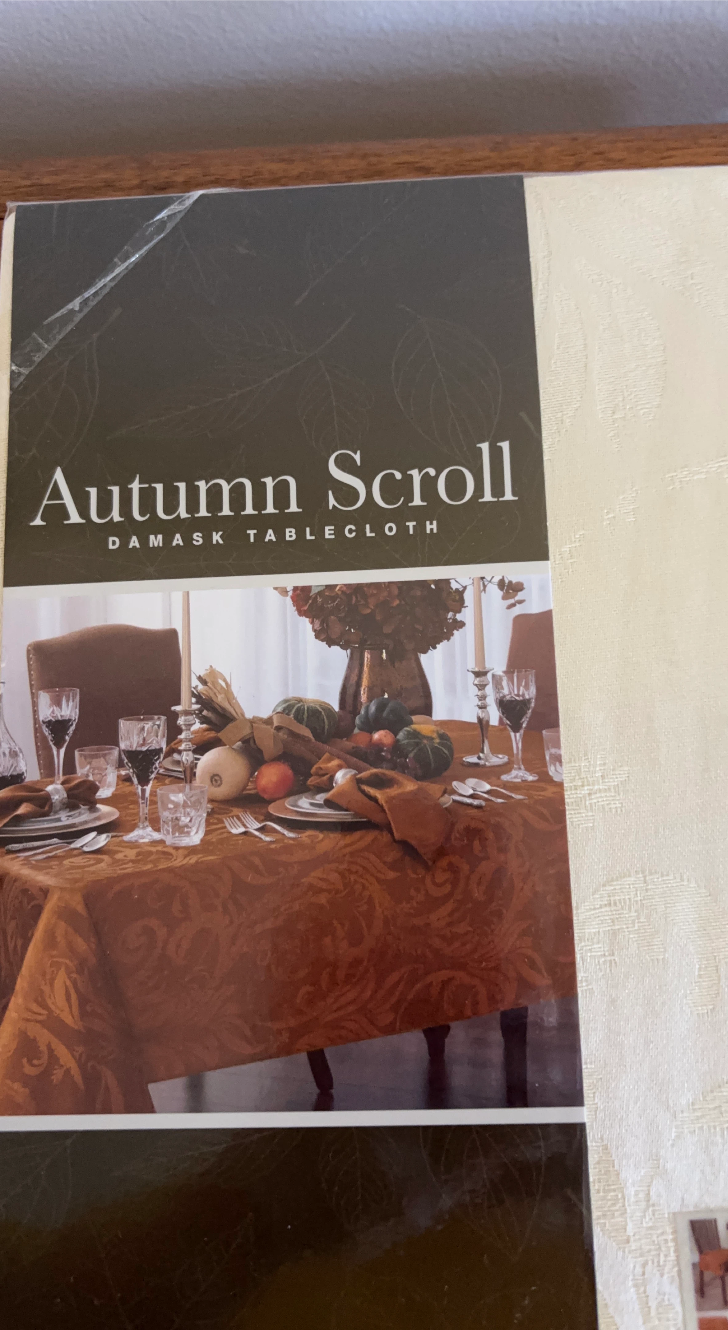 Brand new Autumn Scroll Damask Tablecloth. The tablecloth is 60 in x 104 in (152 cm x 264 cm) oblong. Matching napkin set are available, includes 4 napkins, and each napkin is 17 in x 17 in (43 cm x 43 cm). Sold together or separately. Pickup in White Plains, NY, cash please.