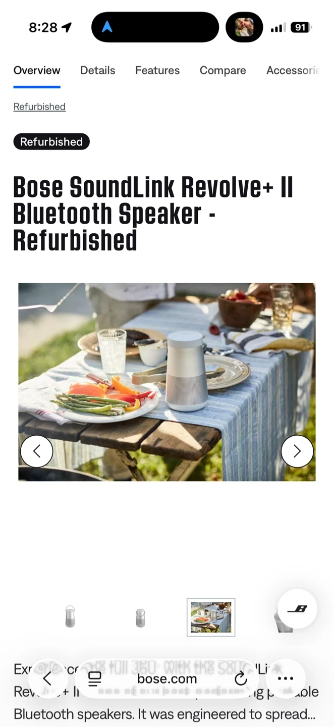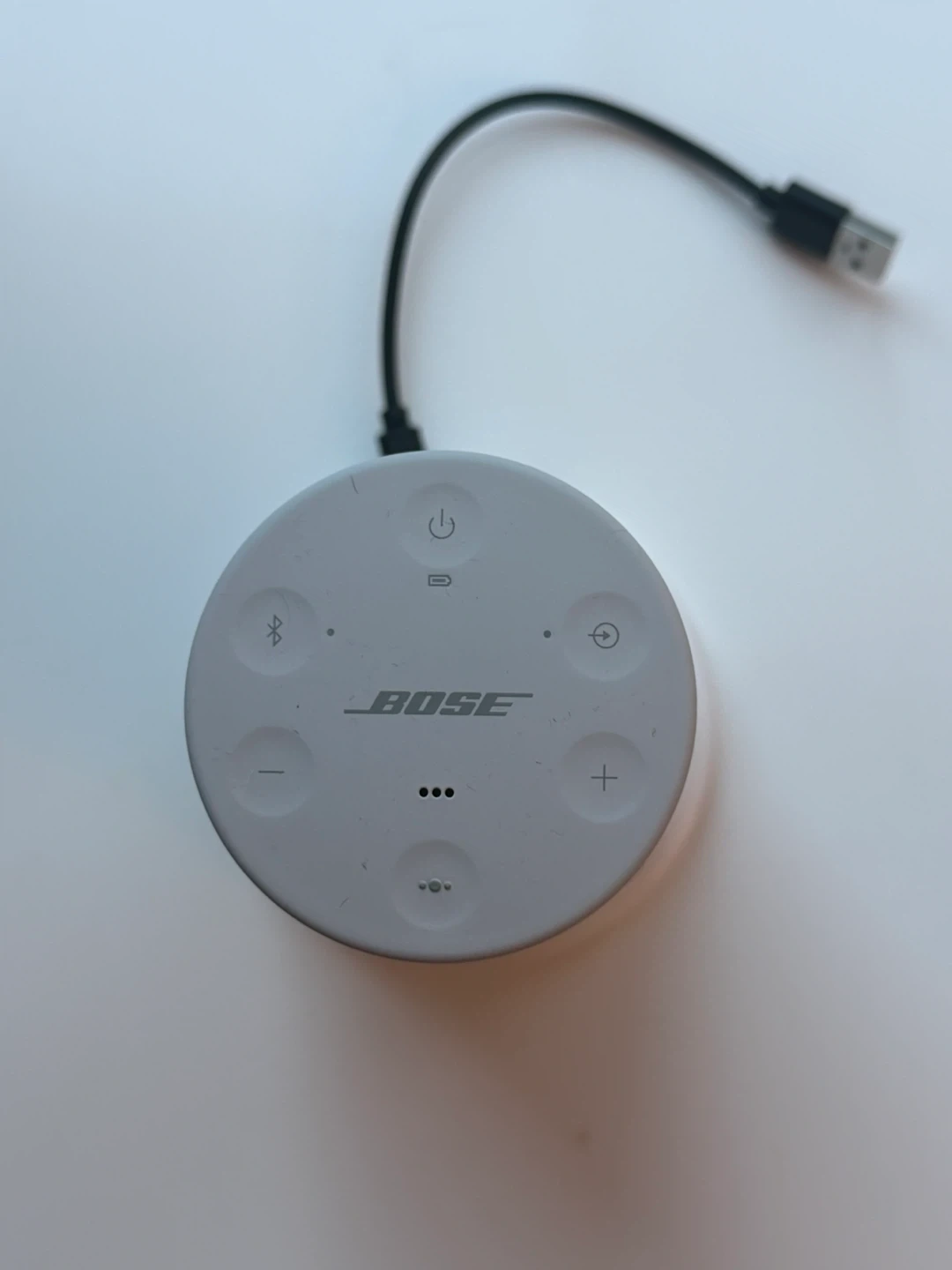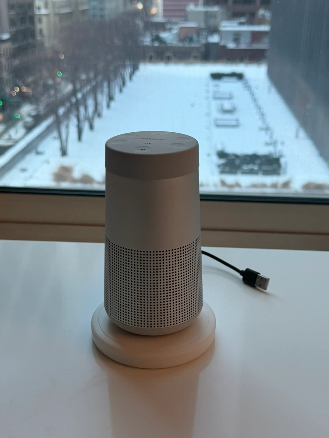 This is a Bose SoundLink Revolve portable Bluetooth speaker in silver. It comes with its original charging cradle and USB cable. It's great for enjoying music wirelessly.
