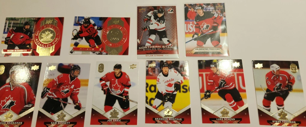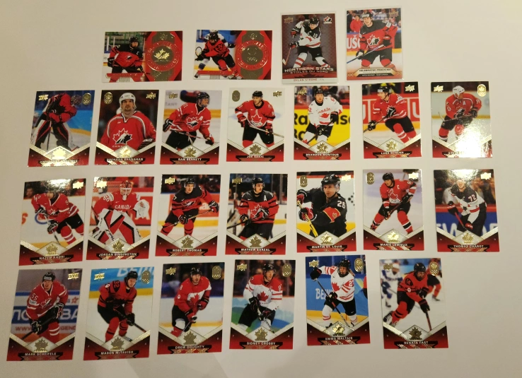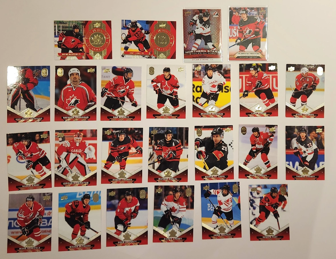 20 base cards + 4 inserts (x2 Gold Medalists; Emily Clark & Mason McTavish + x1 Celebrated Prodigies Mitch Marner + 1x Northern Stars Dylan Strome)