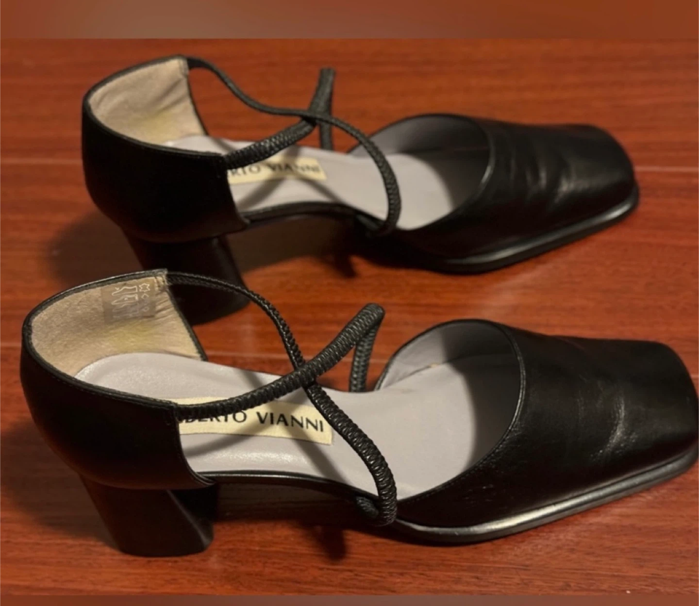 Selling a pair of Roberto Vianni black heels in size 37. They have a unique strappy design and a comfortable block heel.