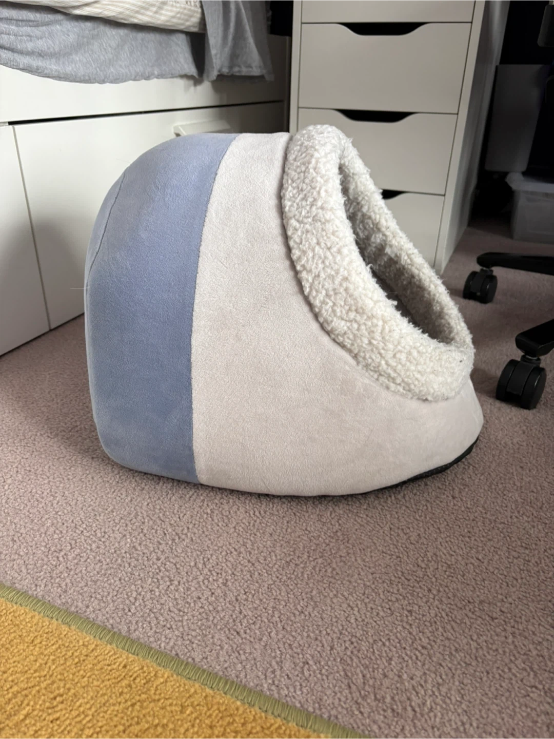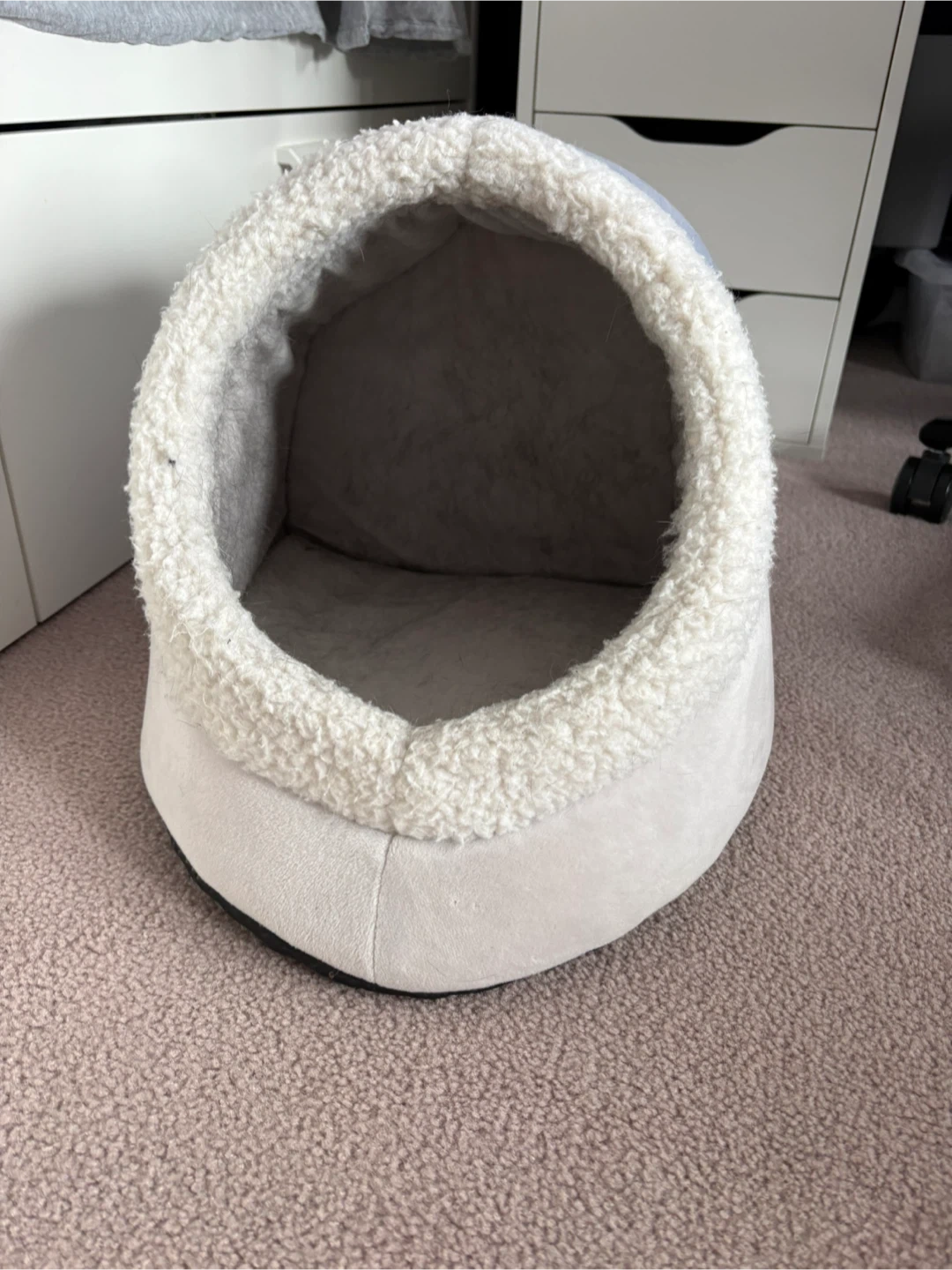 Soft pet bed with a cozy interior. It's made with a durable, easy-to-clean exterior. Offers a warm and secure space for small pets. Great for cats or small dogs! Inner cushion cones out for washing. 11” tall x 13” wide. $15