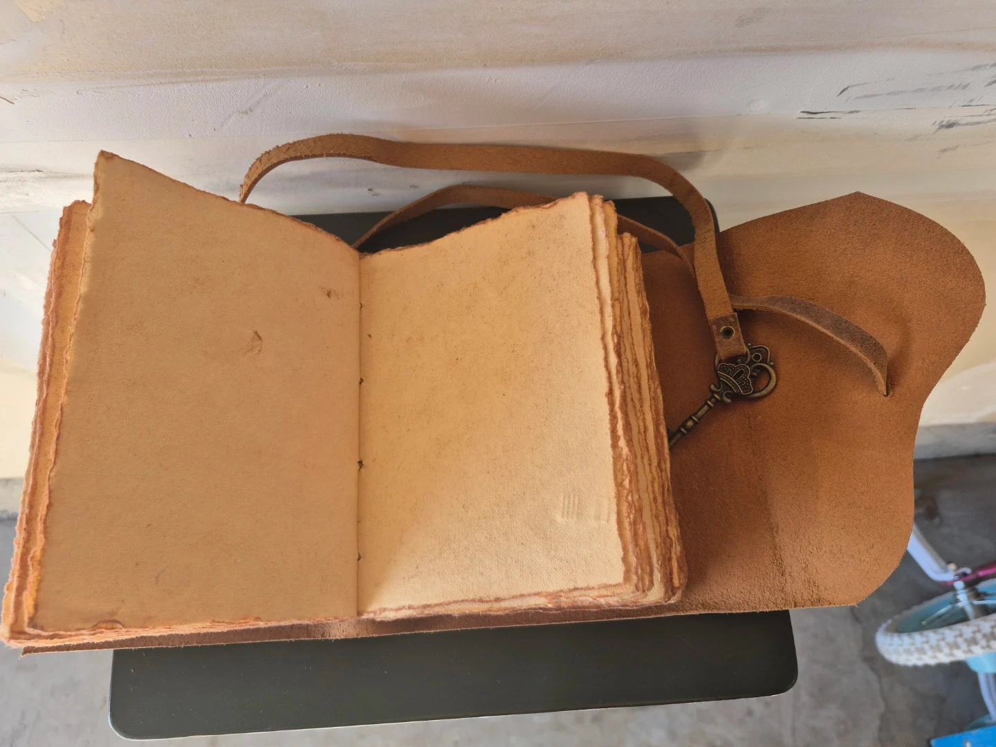 A beautiful, rustic leather-bound journal is ready for your thoughts. It features handmade paper pages and a unique key closure. This journal's vintage style makes it a charming companion for writing or sketching.