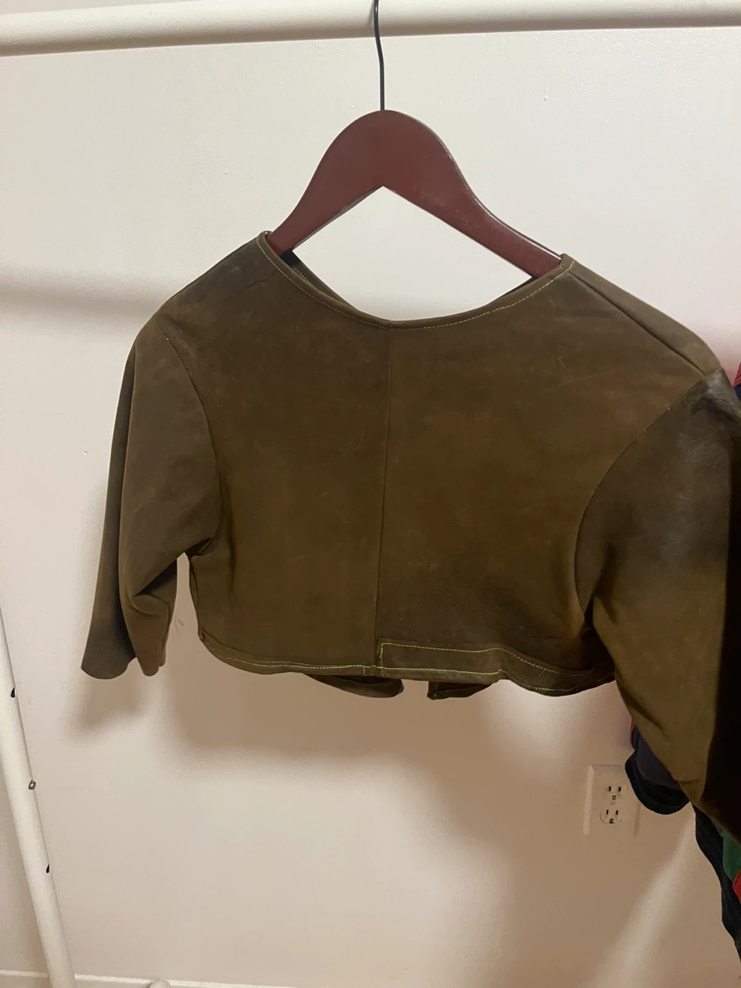 Selling a stylish brown suede bolero jacket! This unique piece is perfect for adding a touch of flair to any outfit. The material is soft and comfortable, and the cropped design makes it a versatile layering option. It's in good condition with a cool, vintage vibe
