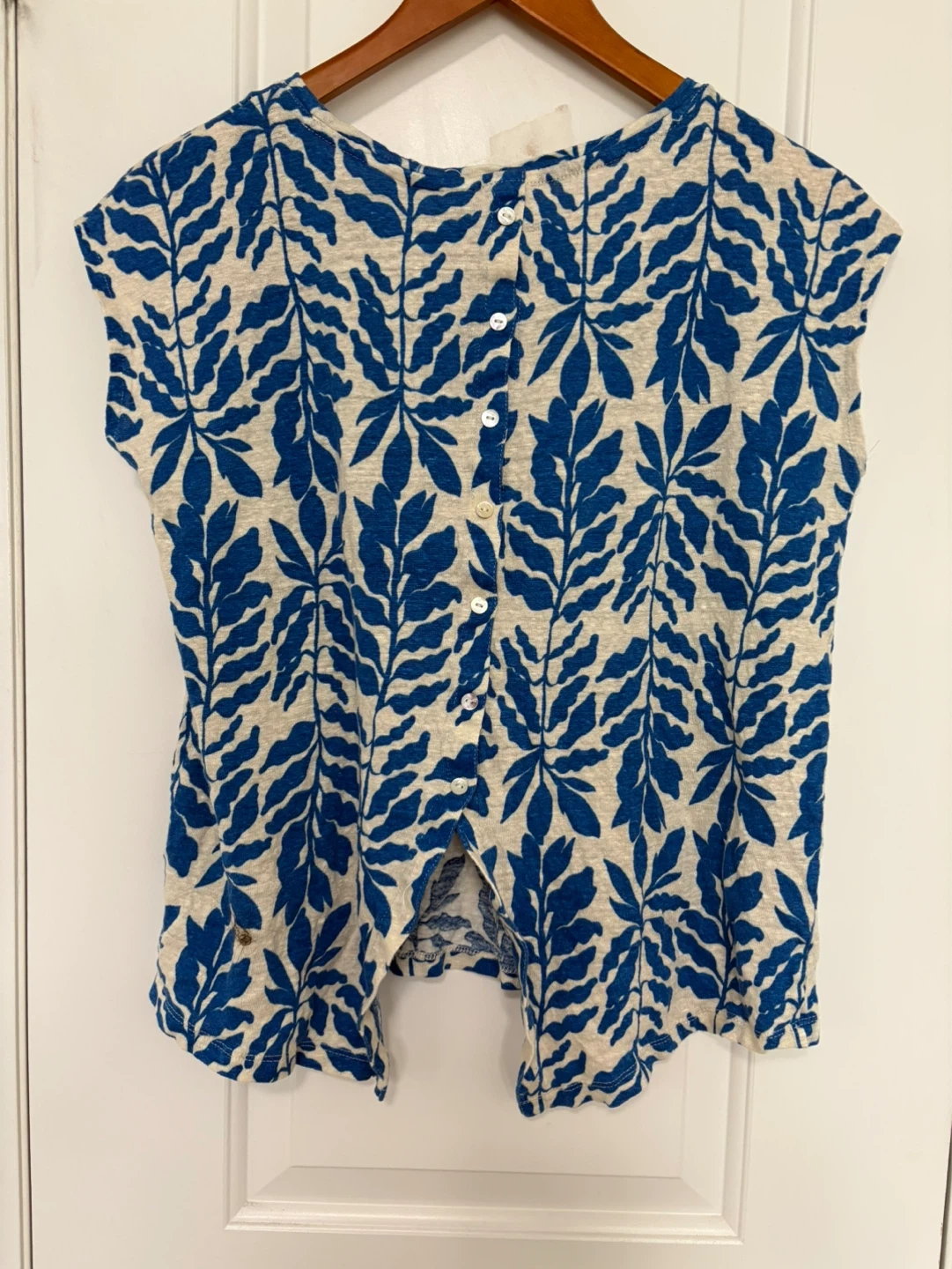 Linen top size women’s large. Great condition! Button closure at the back. Blue and cream coloured pattern. See my other linen tops! Pick up near Sherbourne and Adelaide st east or sometimes at some TTC stations.
