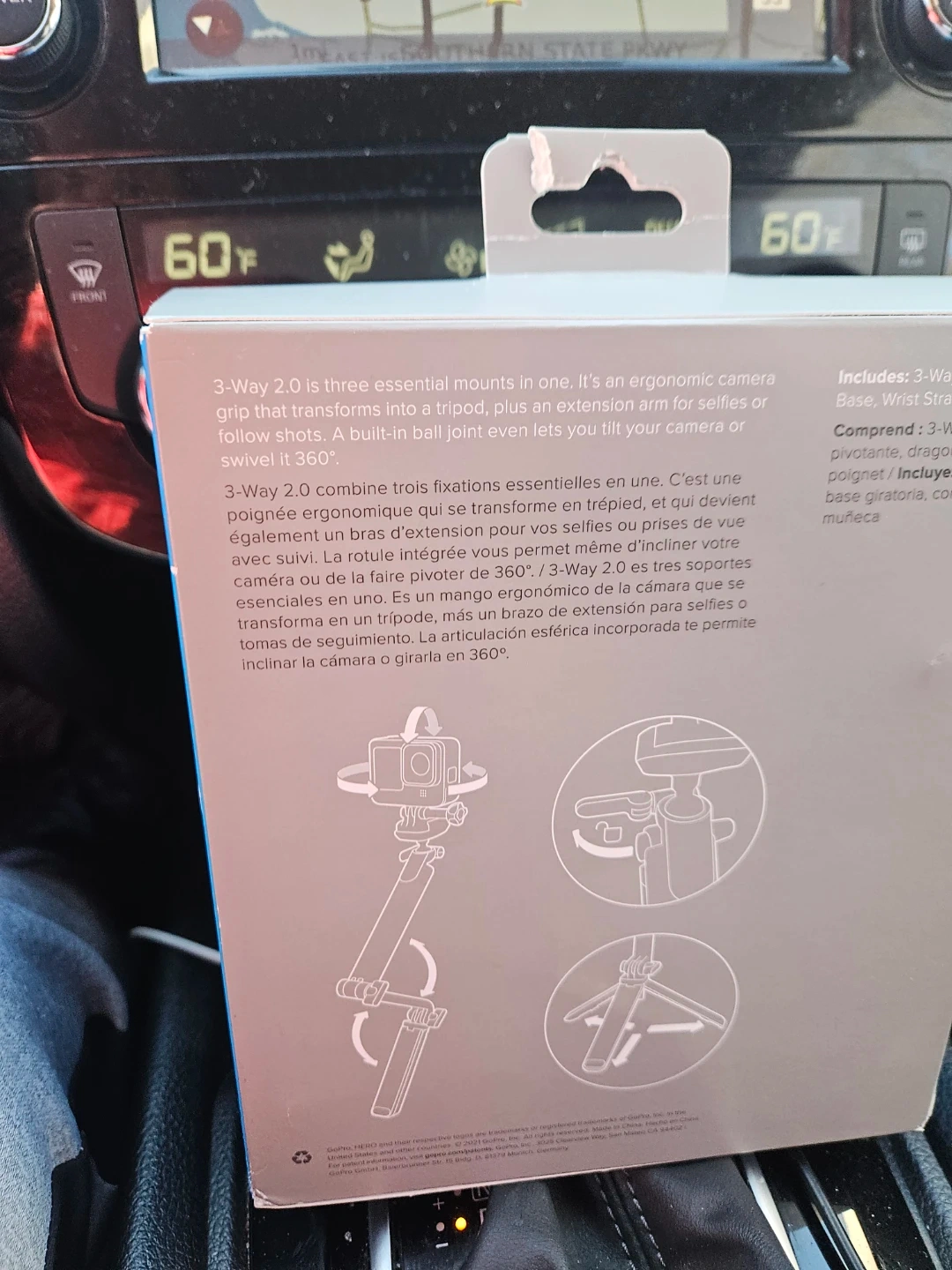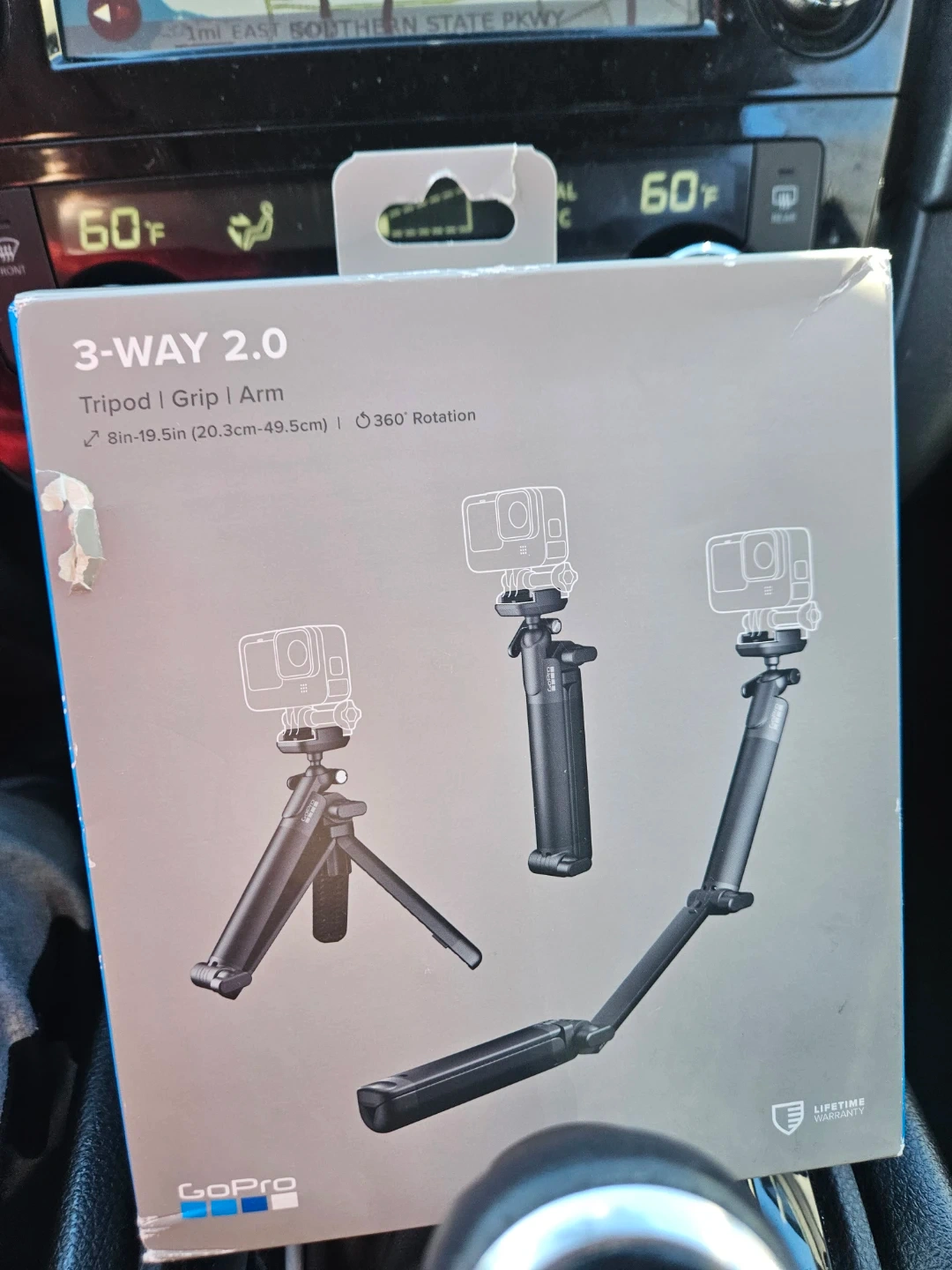 Selling a GoPro 3-Way 2.0! It's a versatile tripod, grip, and extension arm all in one. It's an ergonomic camera grip that transforms into a tripod, plus an extension arm for selfies or follow shots. A built-in ball joint lets you tilt your camera or swivel it 360°. Includes the base, wrist strap, and thumb screw