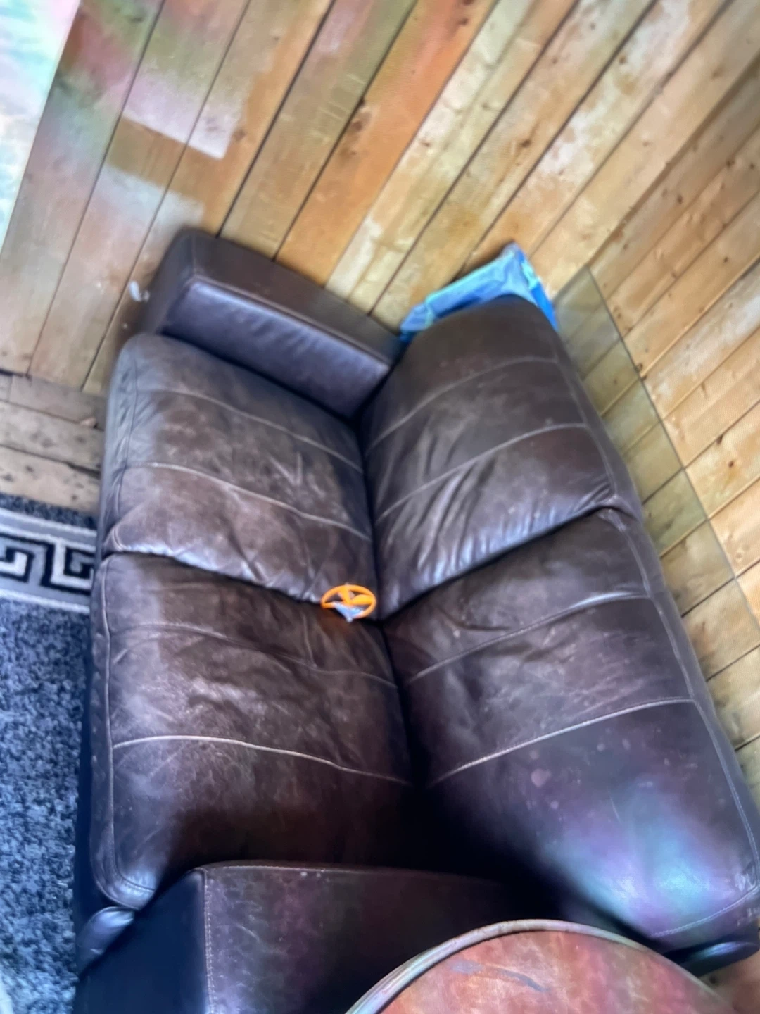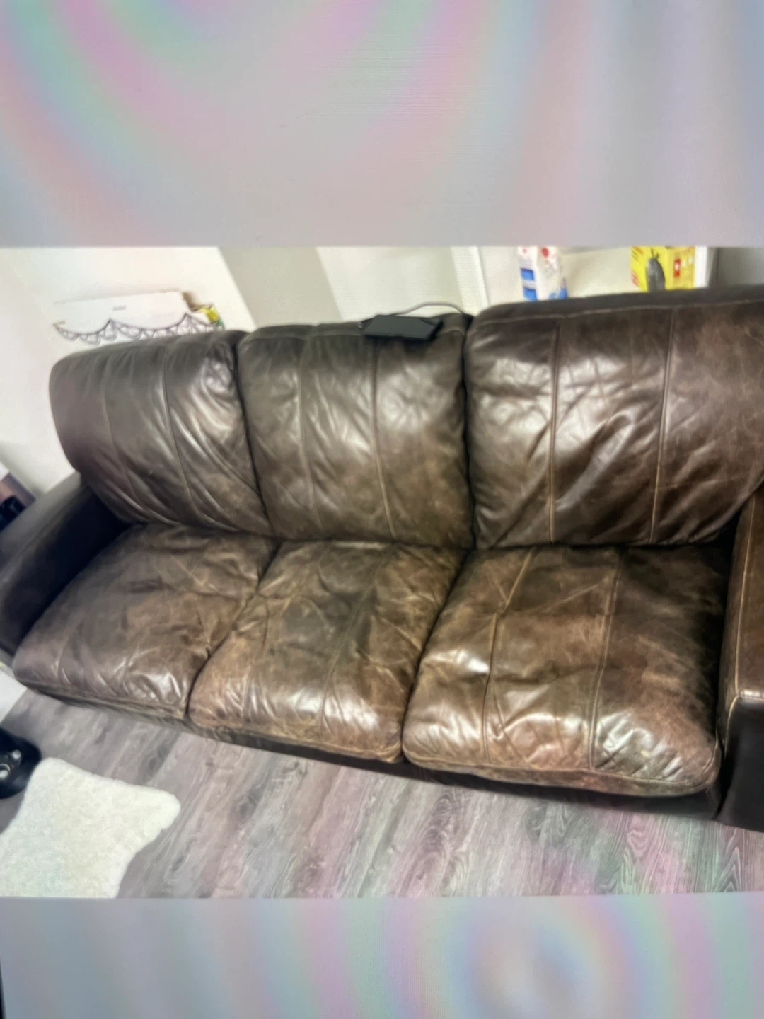 A comfortable brown leather sofa. It has three seat cushions and plush back support. The leather has a distressed look, adding to its character.