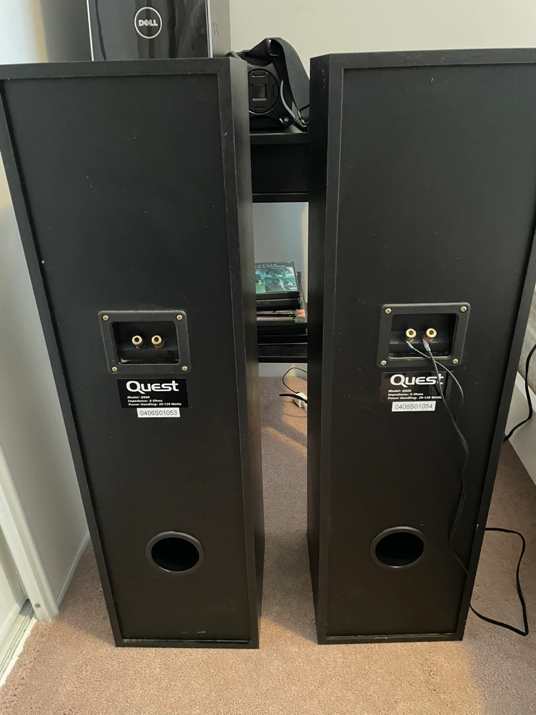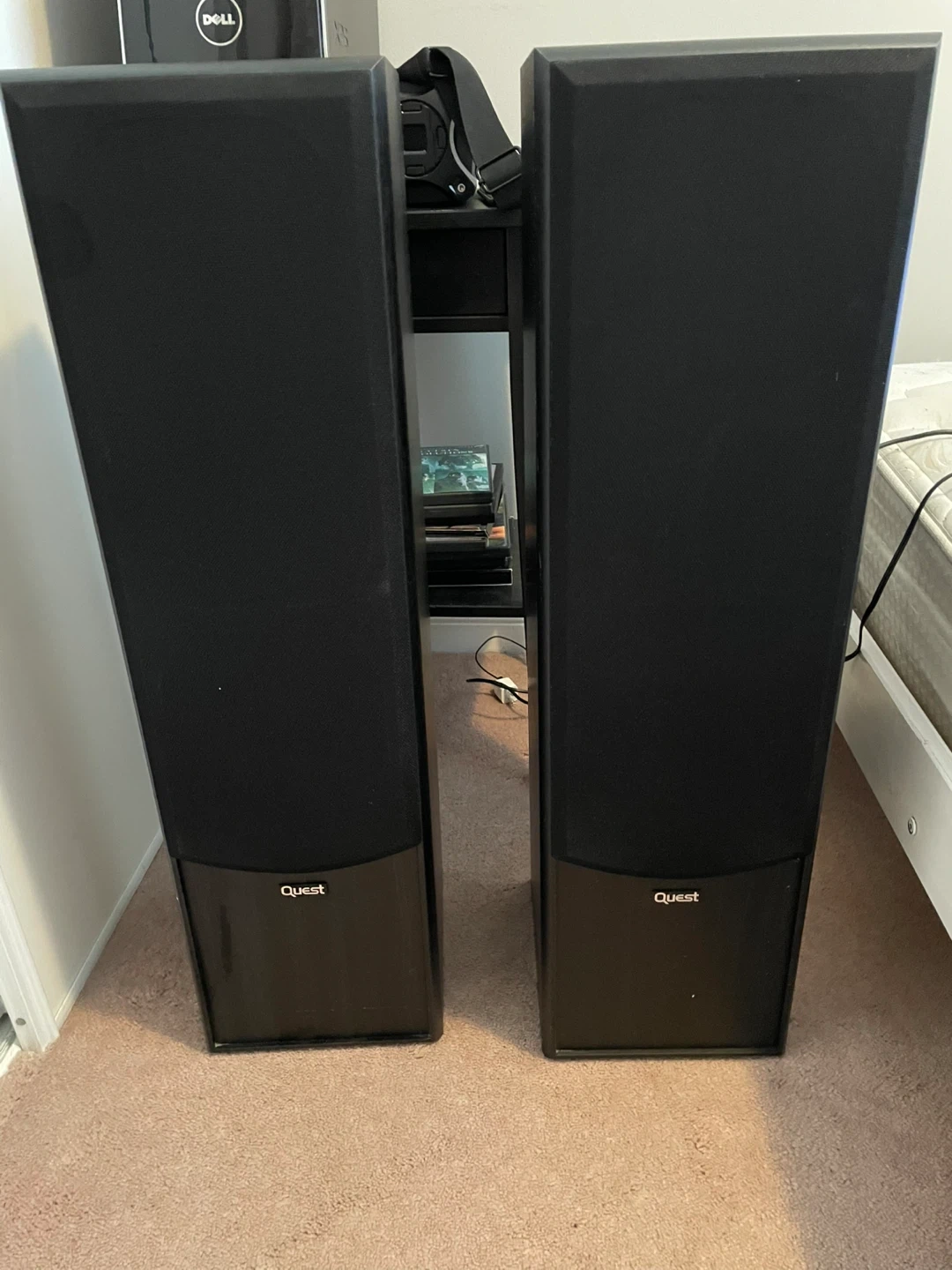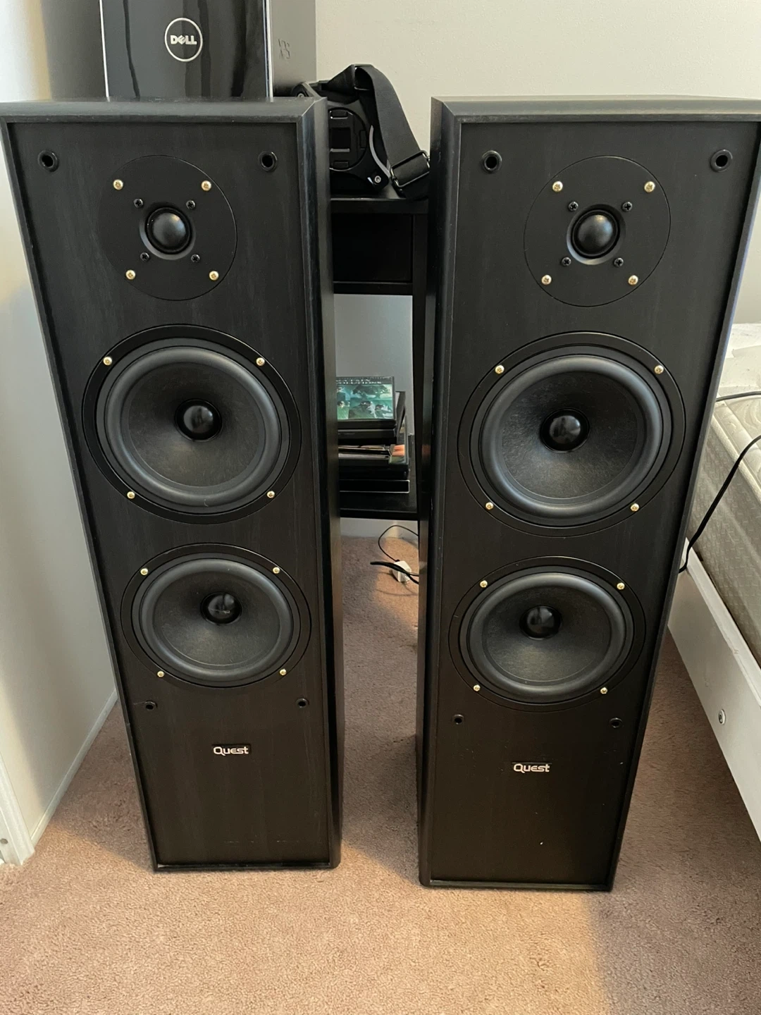 Selling a pair of Quest floor standing speakers. These are large, black tower speakers with dual mid-range drivers and a tweeter. They connect with standard speaker wire terminals at the back. Great for a home theatre setup or music listening!