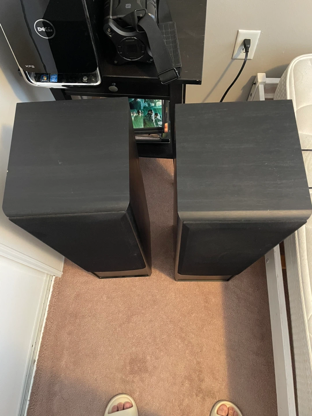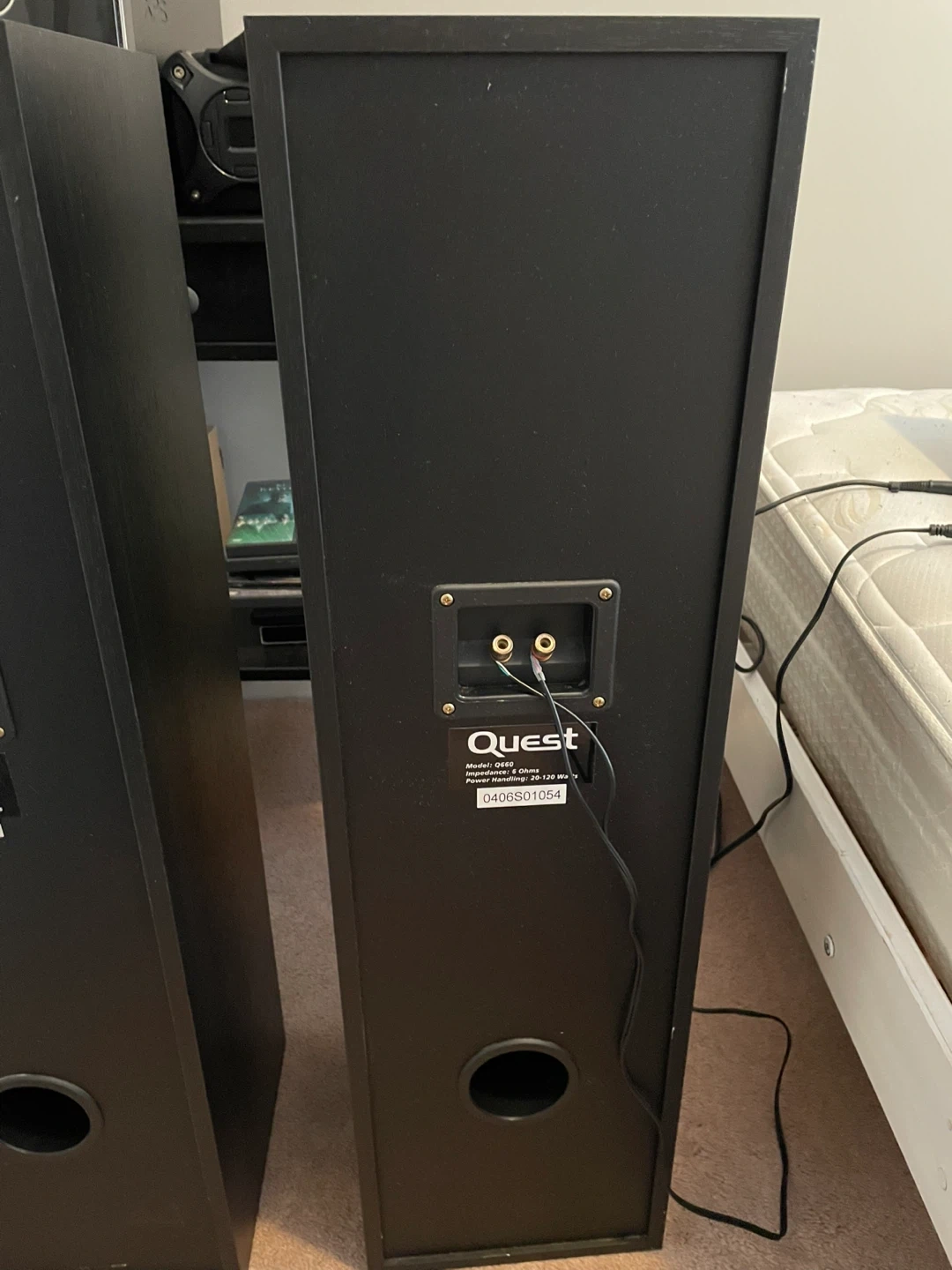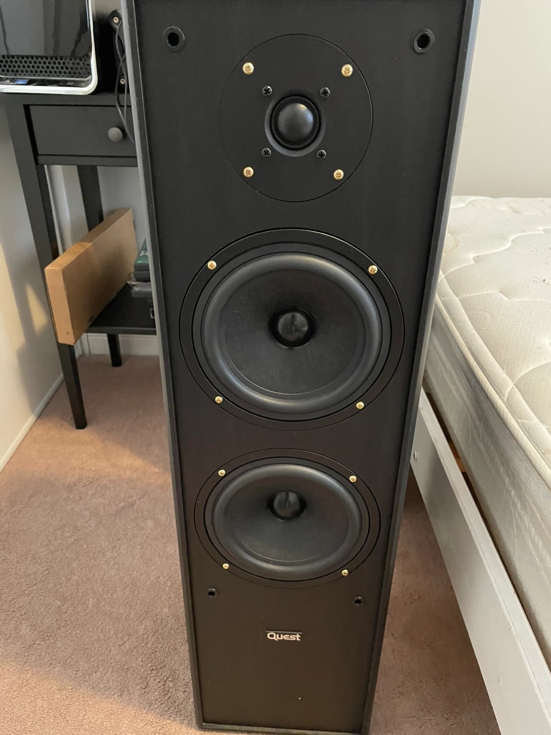 Selling a pair of Quest floor standing speakers. These are large, black tower speakers with dual mid-range drivers and a tweeter. They connect with standard speaker wire terminals at the back. Great for a home theatre setup or music listening!