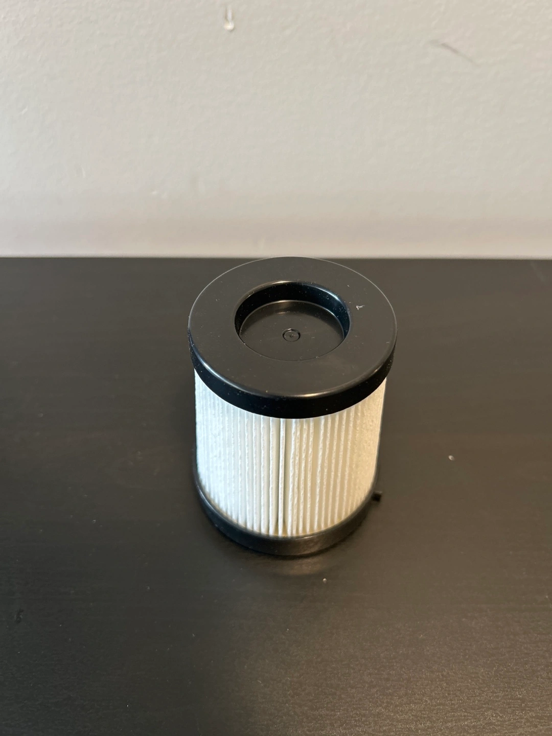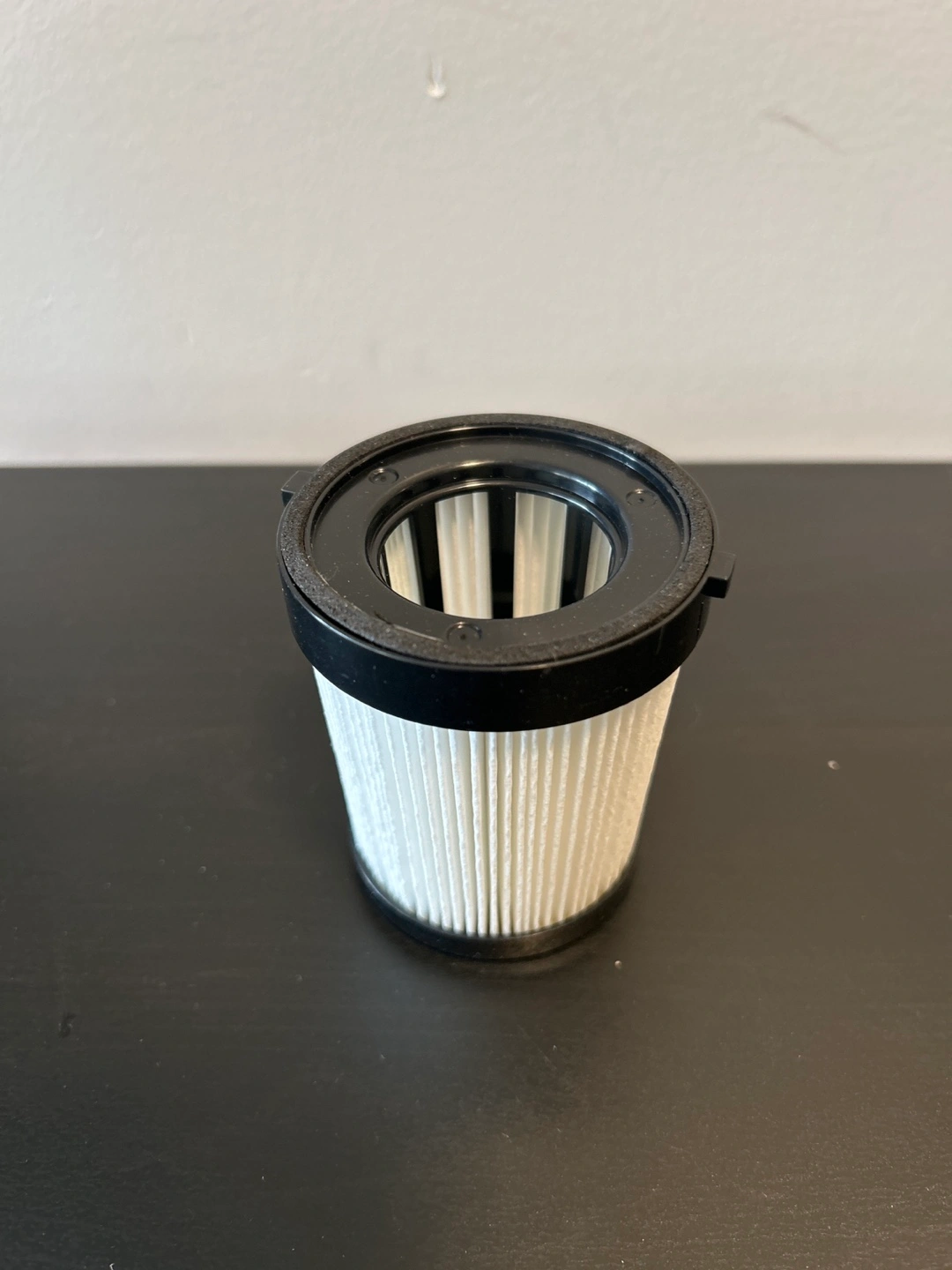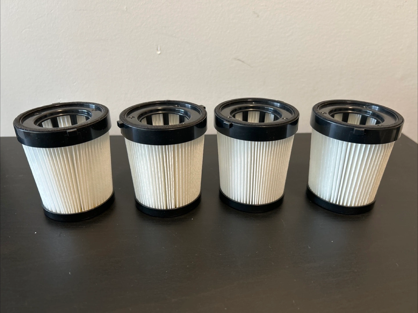 Set of four replacement vacuum filters with pleated white paper elements and black plastic rims. They're designed to fit specific vacuum models. Keep your home clean and air fresh!