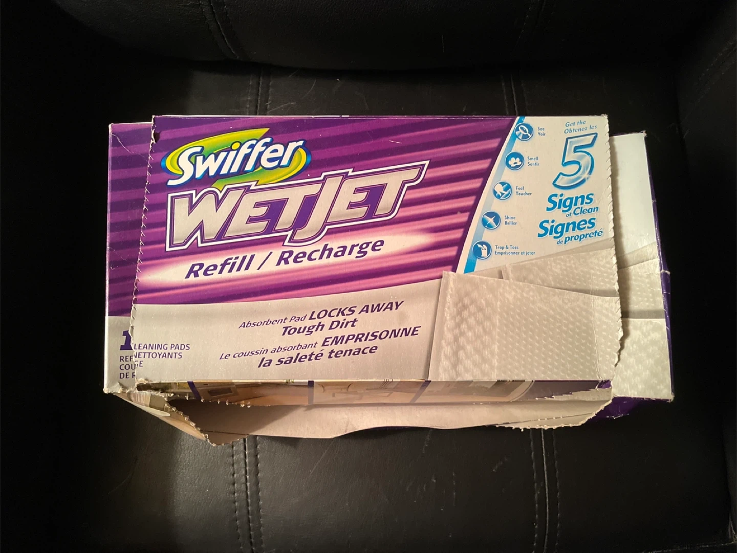 Open Swiffer WetJet Refill pack with eight pads remaining. This refill is designed to lock away tough dirt. It helps you see, smell, feel, and shine to get 5 signs of clean!