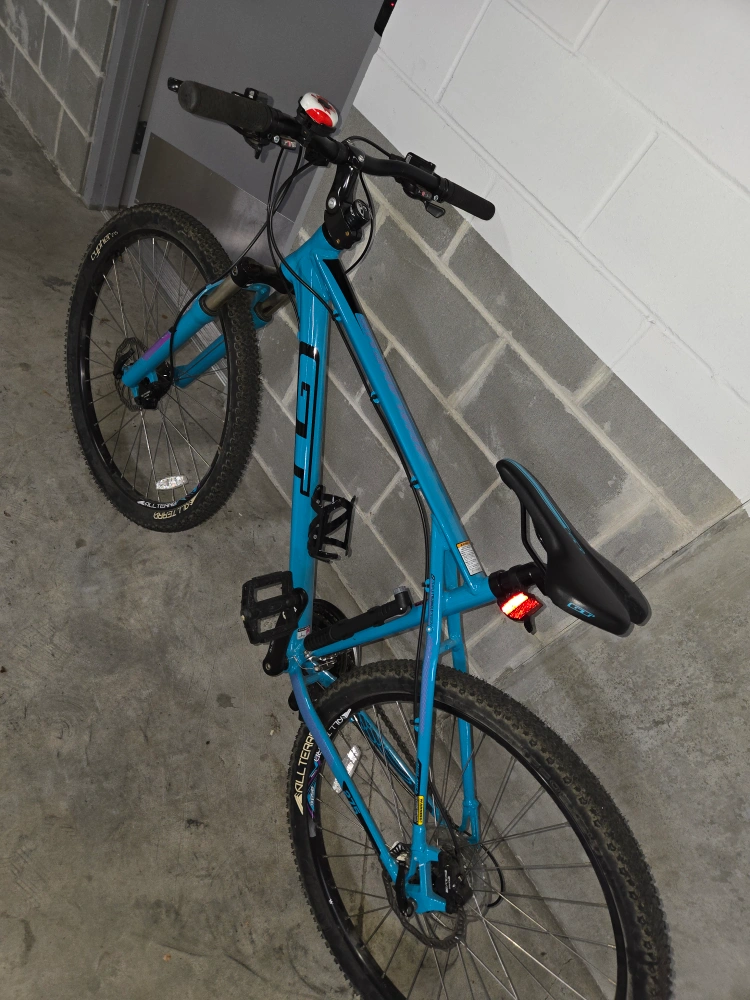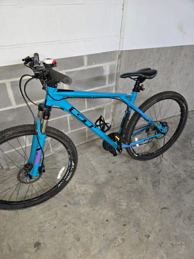 23Blue mountain bike with disc brakes. Good condition. Comes with tire pump attached to bike. only been ridden once or twice brand new basically.