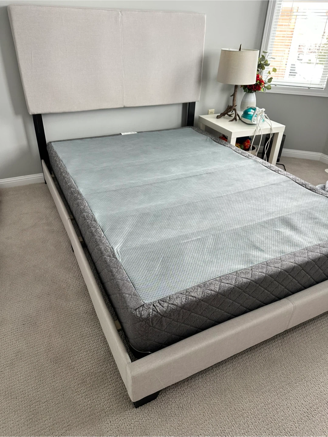 This upholstered bed frame comes with a matching headboard. It's a full/double size and features a sturdy slat system. Also comes with a mattress and box spring purchased from The Brick approximately 2 years ago, barely used and always had a protecter on it - this bed was for our guest room.
