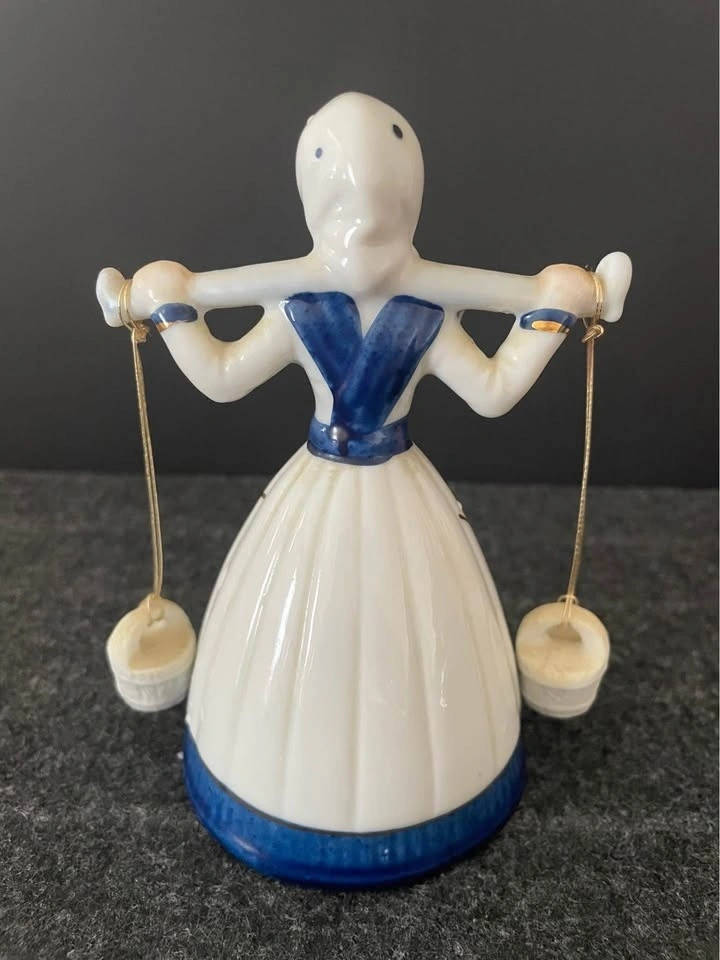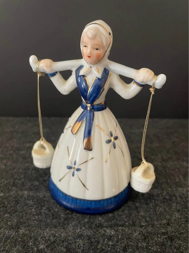 Vintage English Bisque Figurine « Dutch Milkmaid Carrying Buckets » 5 inches high, hand painted gold trim, lovely sound! This cutie is a perfect addition to any collection.