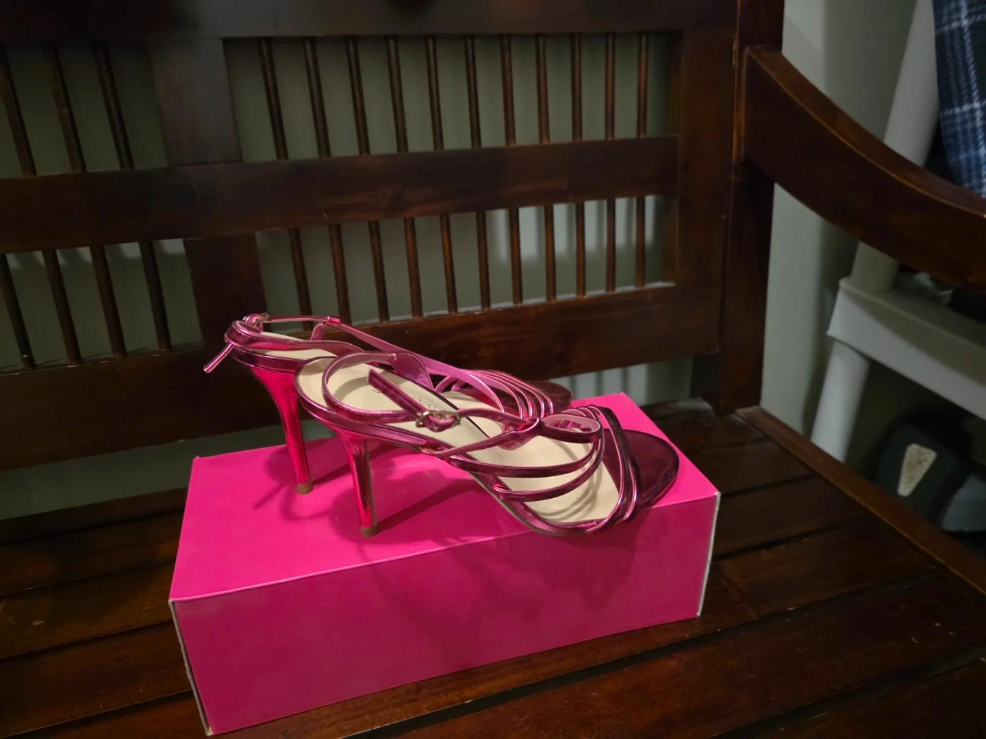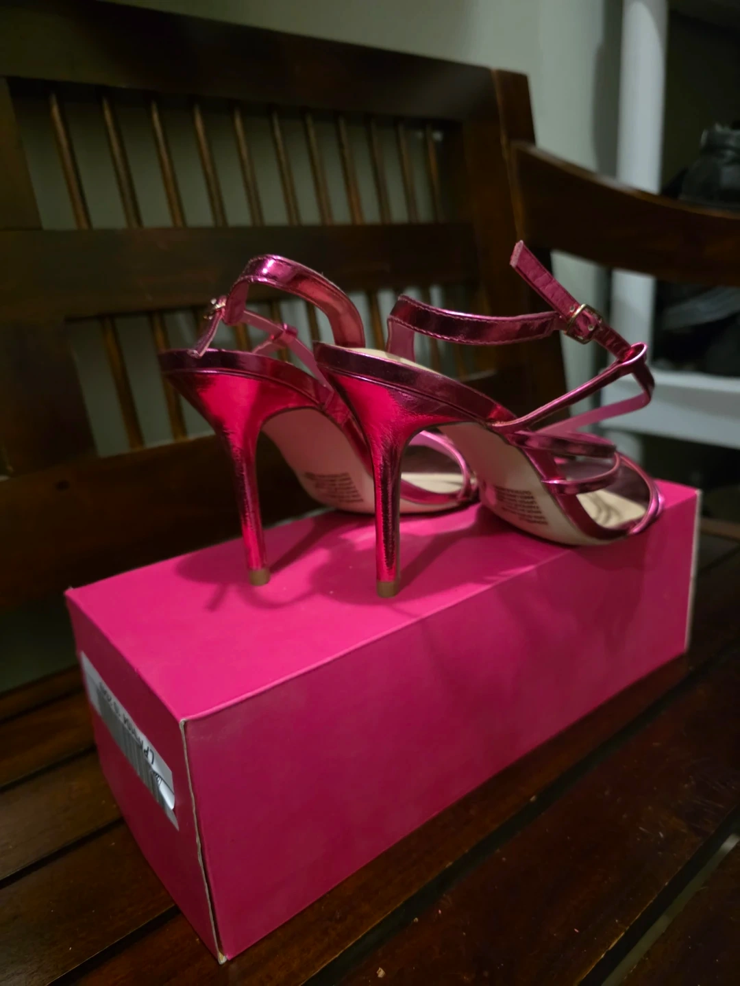 These stylish strappy heels feature a shimmering pink metallic finish and a classic stiletto heel. They come with an adjustable ankle strap for a secure fit. Perfect for adding a pop of colour to your evening wear!
