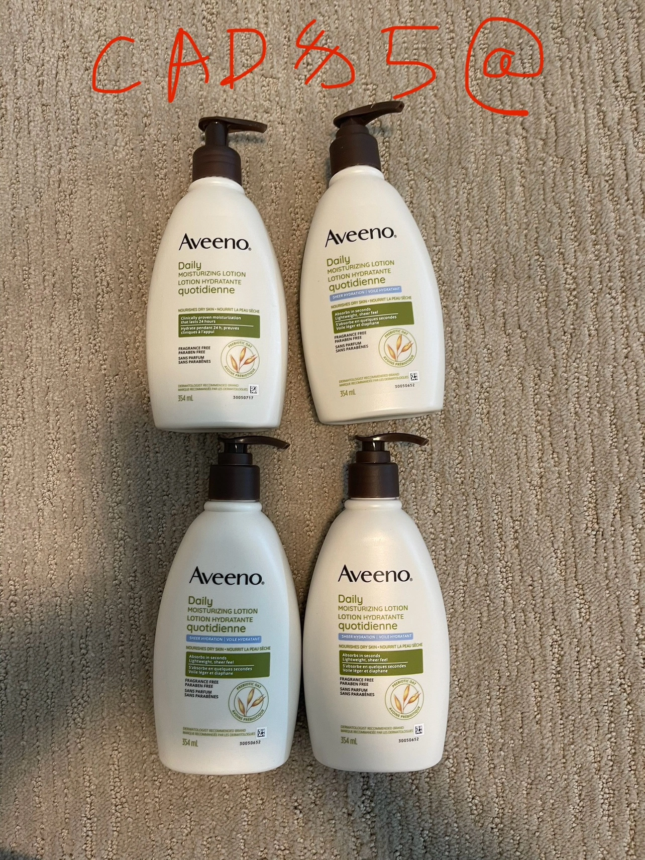 I have four bottles of Aveeno Daily Moisturizing Lotion, each containing 354ml. This lotion nourishes dry skin and provides hydration that lasts for 24 hours. It's also fragrance-free and paraben-free, making it suitable for sensitive skin. Lightweight and absorbs quickly!