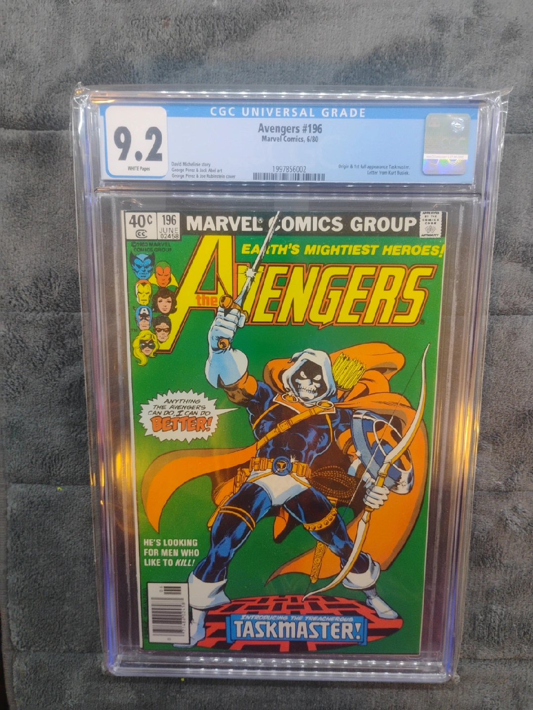 104Selling a graded copy of Avengers #196 from Marvel Comics, graded 9.2 by CGC. This comic features the first full appearance of Taskmaster and has a cover by George Pérez and Joe Rubinstein. A great addition to any comic book collection!