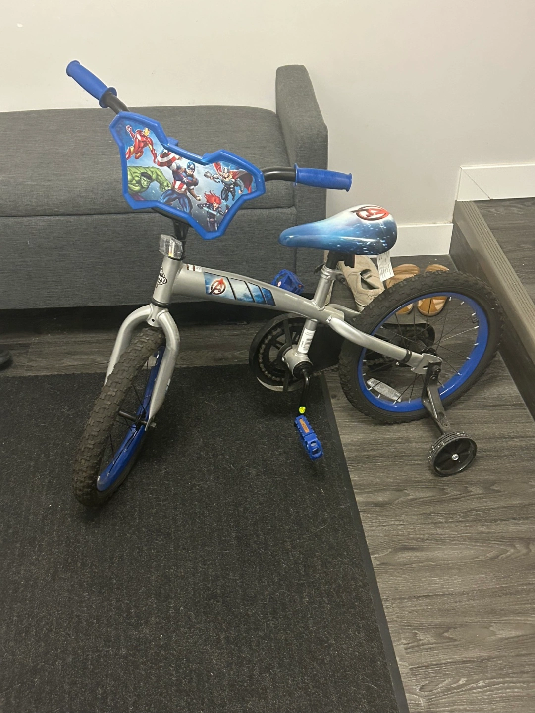 Selling an Avengers-themed kids' bike! It's in good condition and ready for a new superhero in training. It features cool Avengers graphics and is perfect for learning to ride with the included training wheels. Great for any young fan! Helmet included!