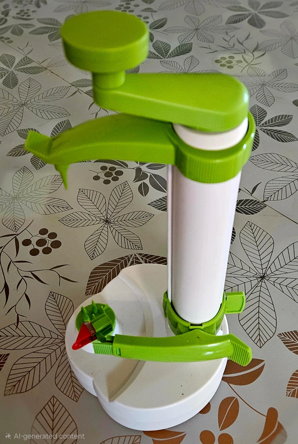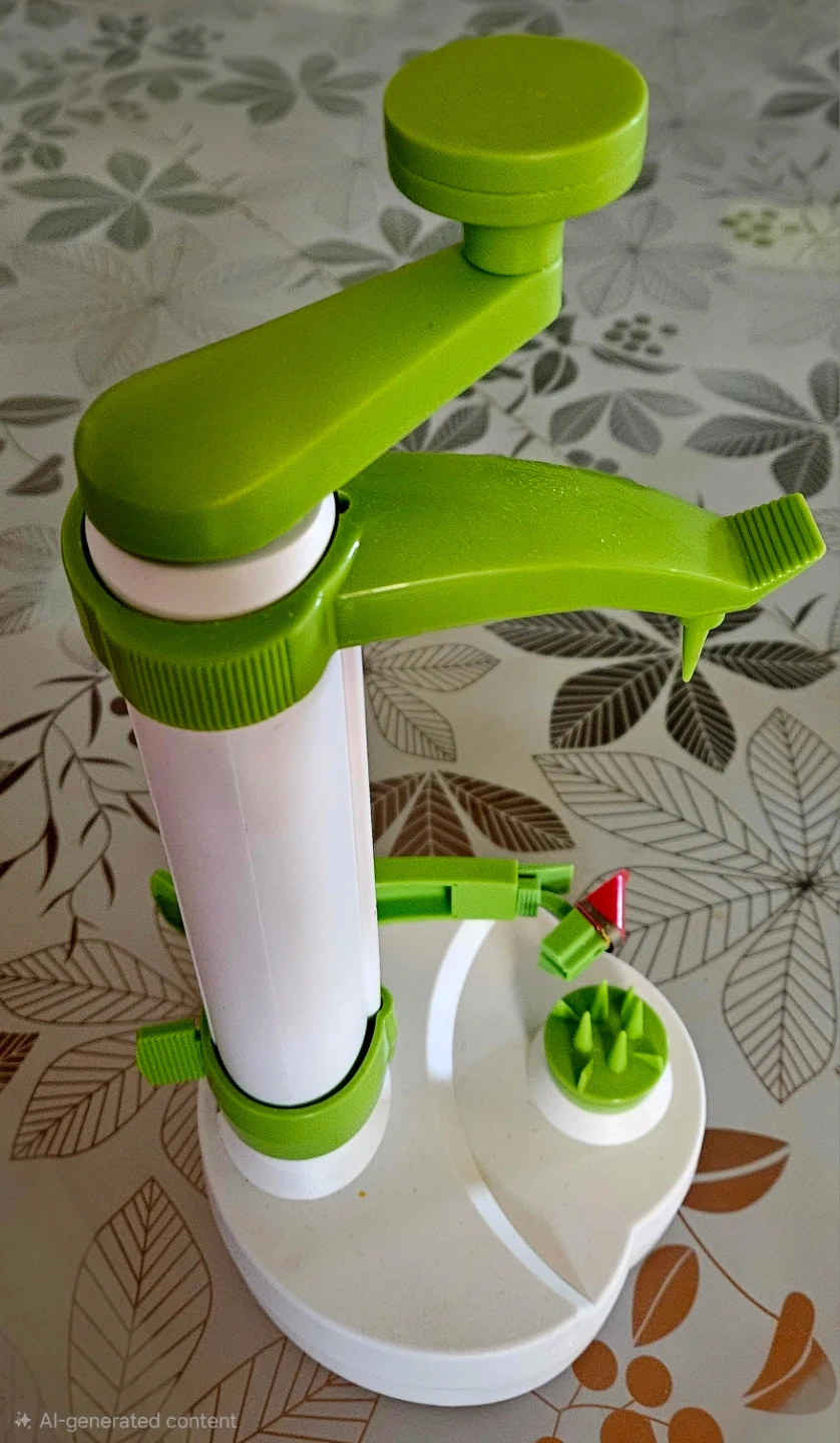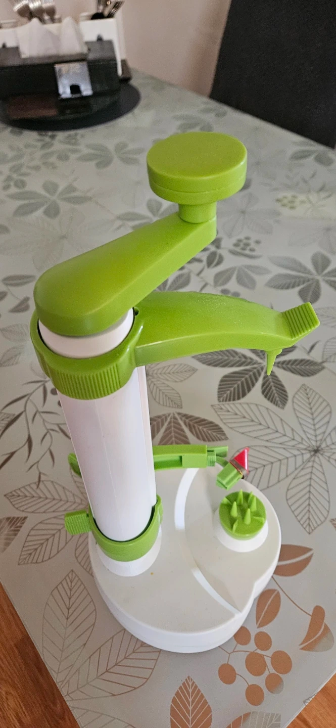 This Rotato is designed to peel, core, and slice apples quickly. It's made of durable plastic and features a crank handle for easy operation. Perfect for making apple pies or snacks!