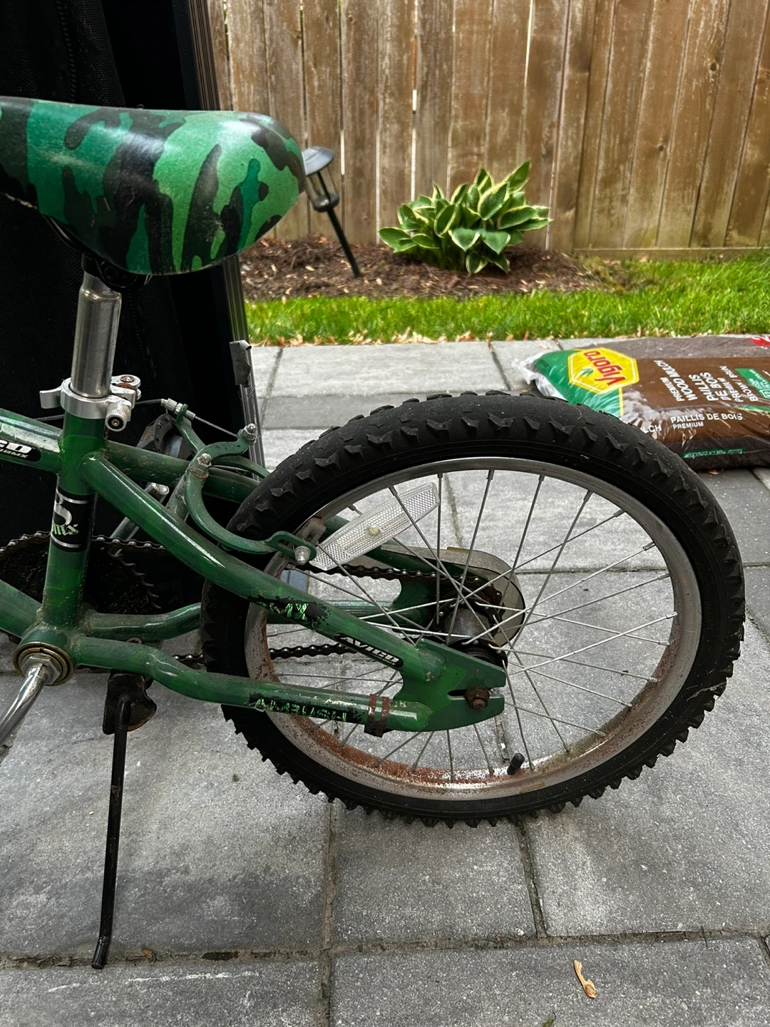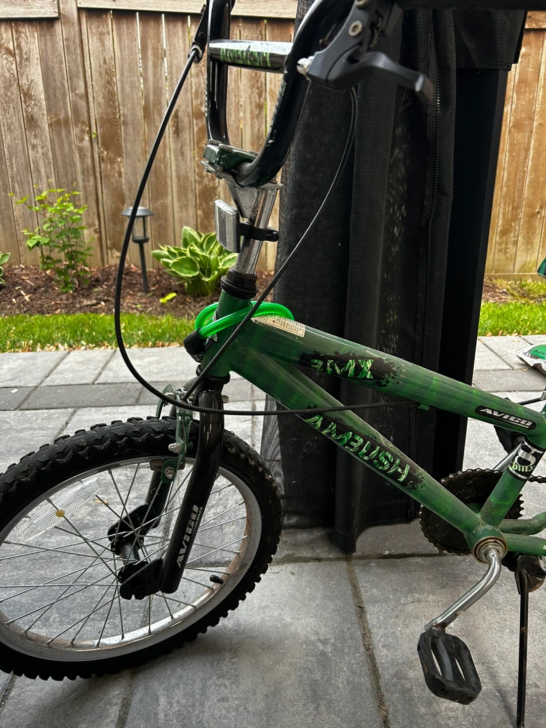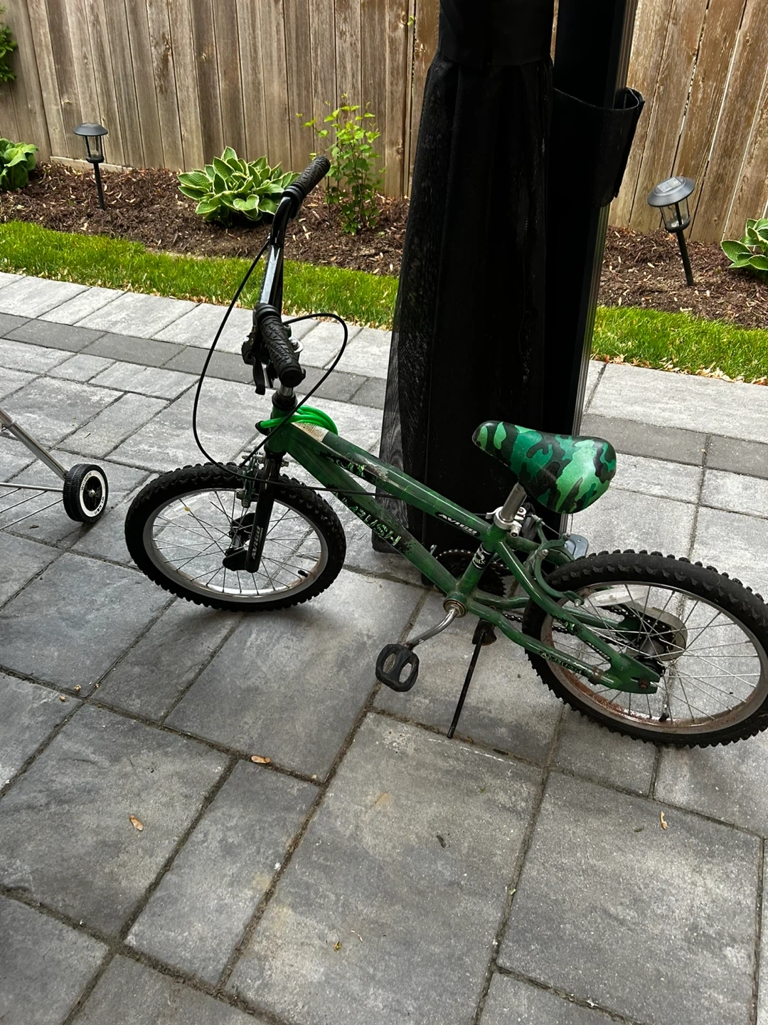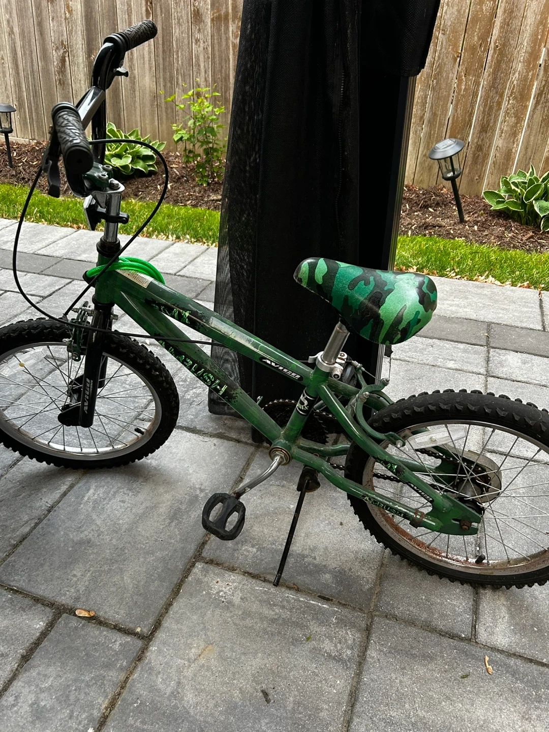 13Selling a used Avigo BMX kids bike. It's green with a camouflage seat. It has some signs of wear but is still in good working condition. Perfect for learning to ride!