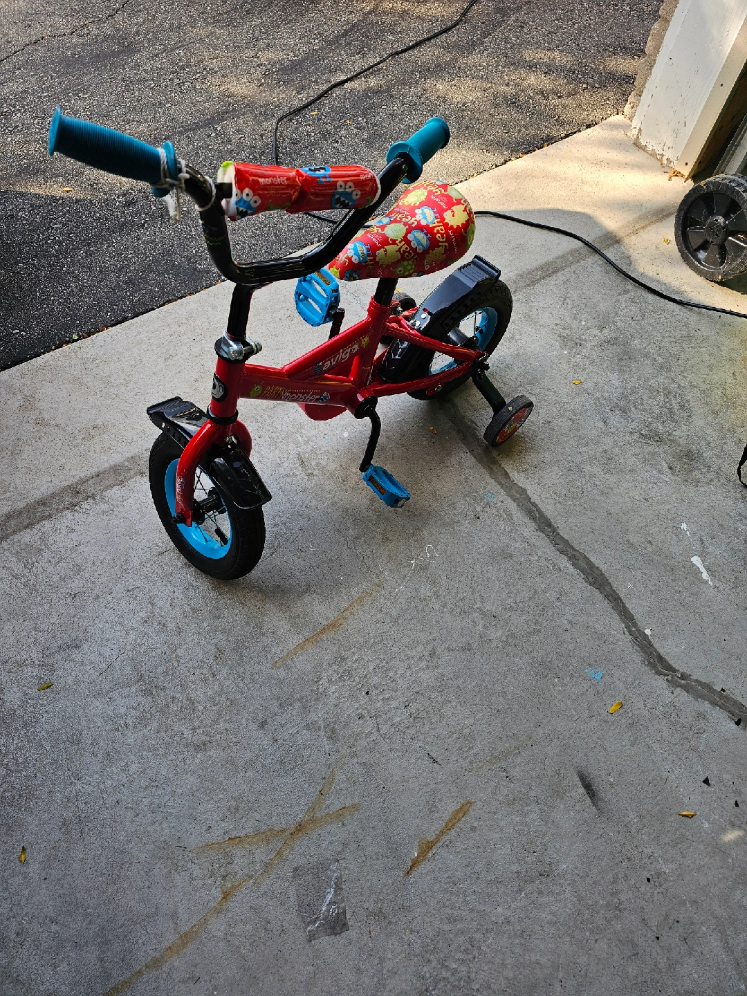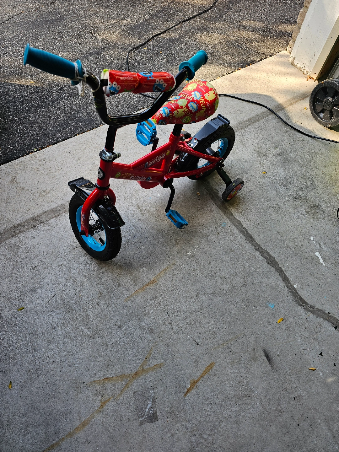 Selling a cute Avigo kids' training bike in red and blue! It's perfect for little ones learning to ride. The bike features training wheels and is in good condition for your child's first biking adventures