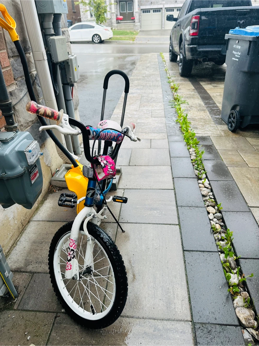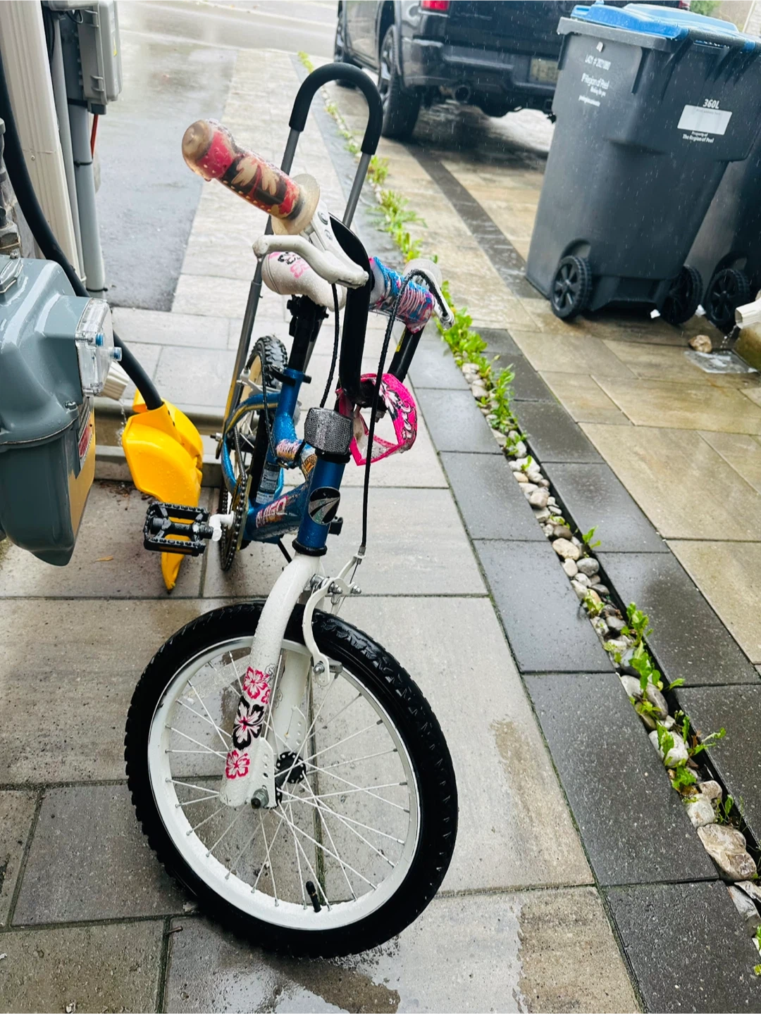 Selling a cute Avigo Lilac girls' bike! 16-inch bike, perfect for young riders. The bike features a fun design with lilac and floral accents. Great for learning to ride or just cruising around the neighbourhood!