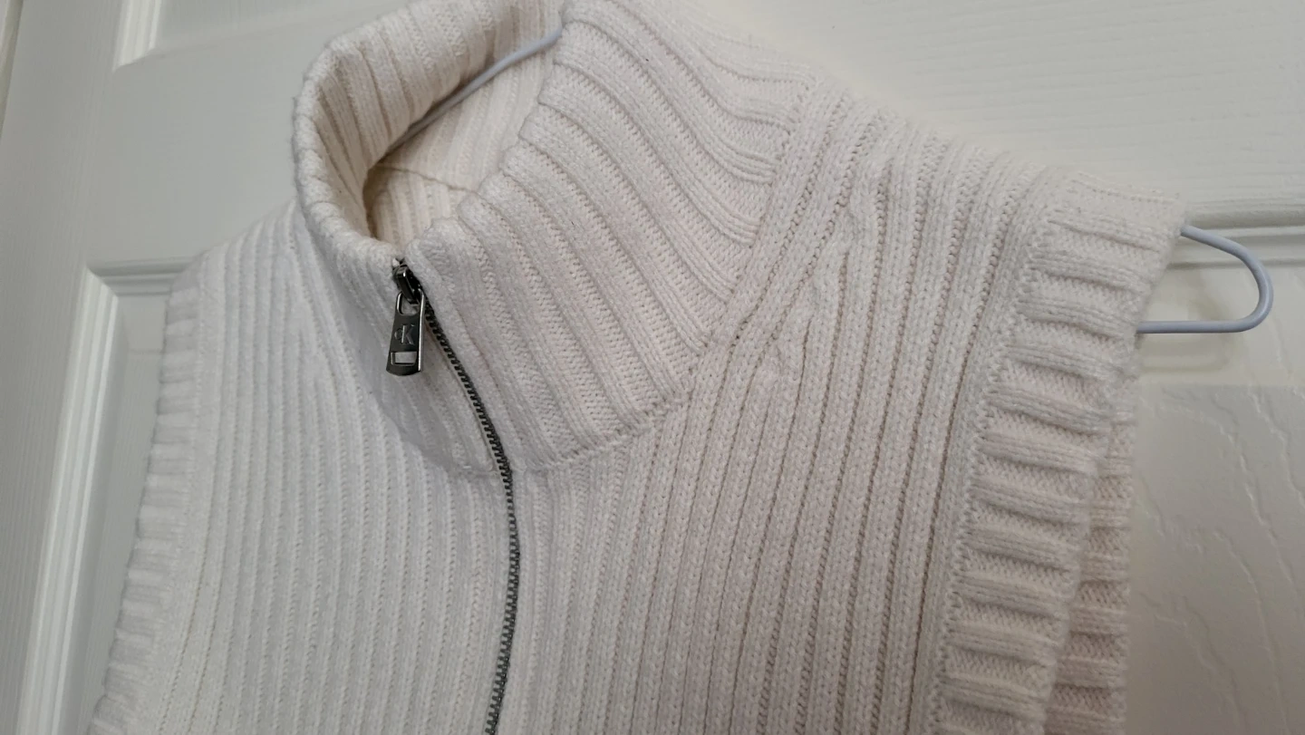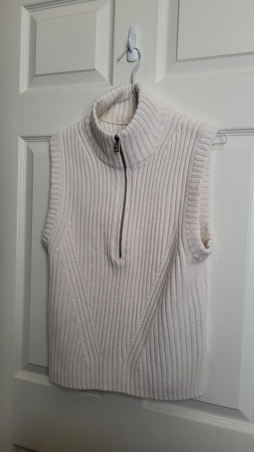 Cream-coloured sweater vest from Calvin Klein Jeans. It features a mock neck and a quarter-zip front. Ribbed knit material. Size Medium, fits S-M.