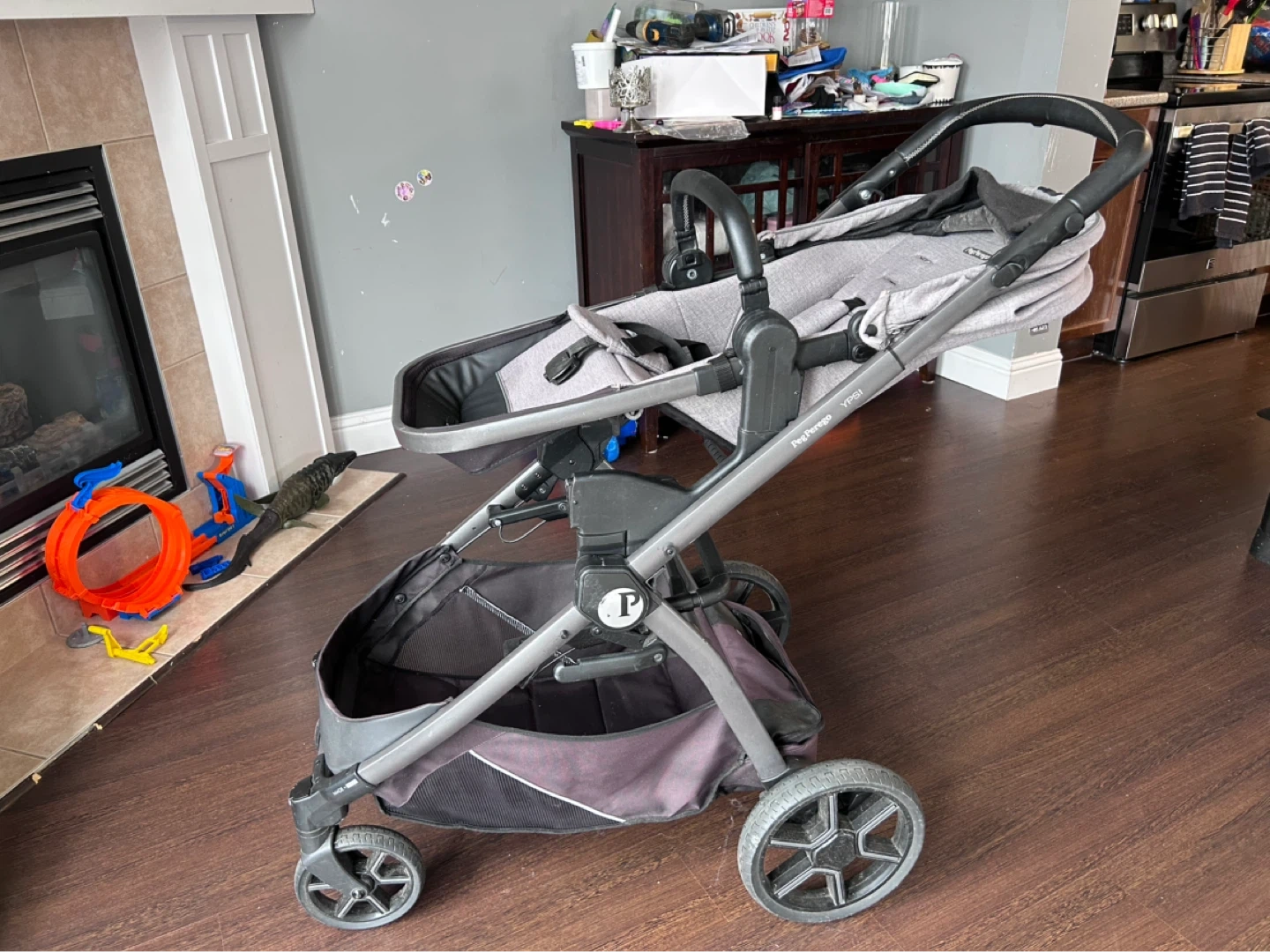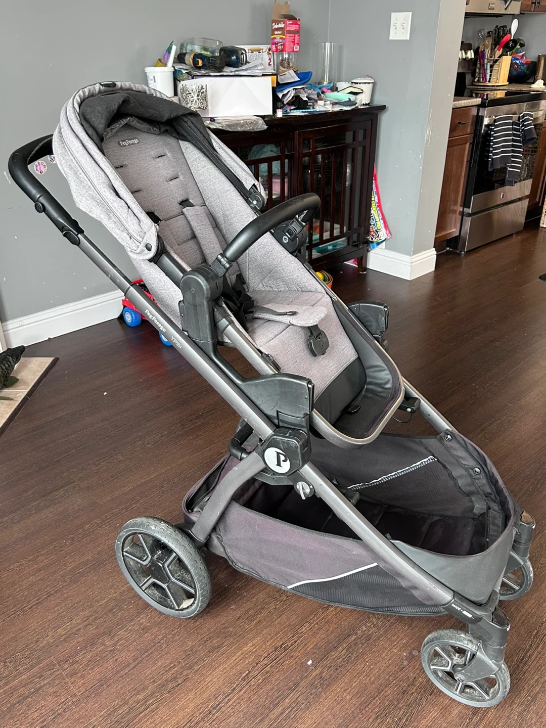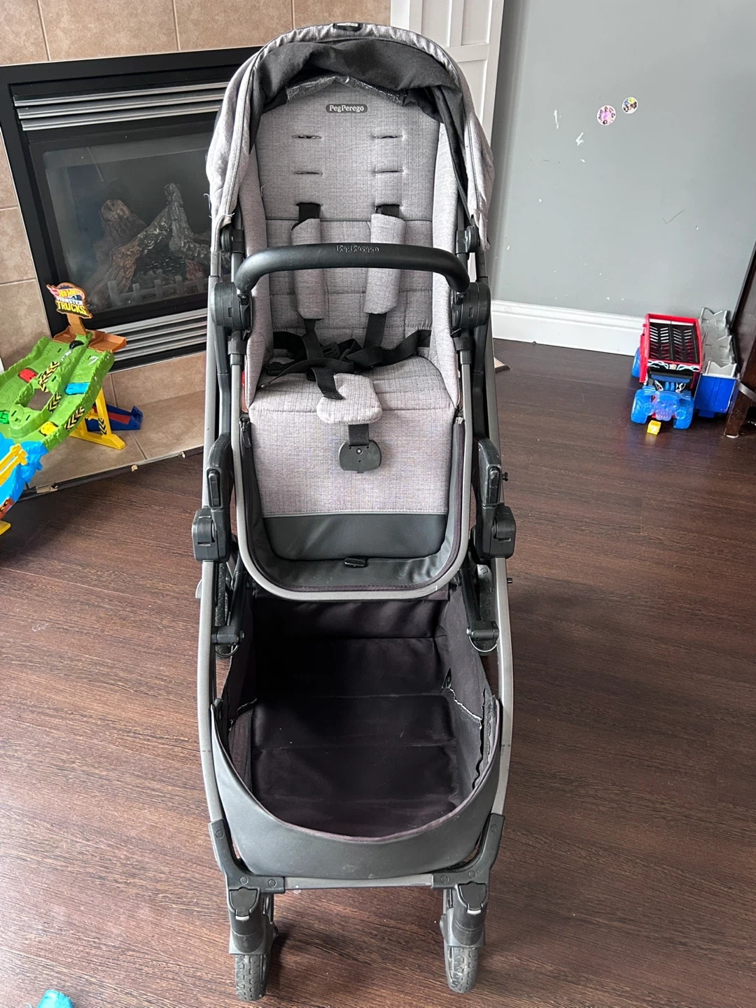 Grey Peg Perego stroller with adjustable handle and large storage basket. It's a comfortable and convenient option for getting around with your little one. The seat reclines for napping.